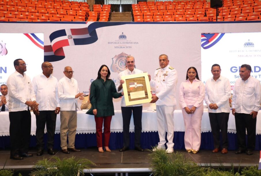 Al concluir el acto, el director de Migración junto a los subdirectores de la institución entregó un reconocimiento al presidente Luis Abinader por su liderazgo en la implementación y fortalecimiento de una política migratoria responsable en la República Dominicana.