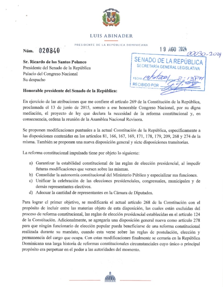 Abinader somete este lunes ante el Senado una Reforma a la Constitución