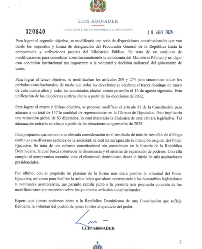 Tal y como había sido anunciado previamente por el presidente Abinader, la propuesta de reforma constitucional impulsada tiene cuatro objetos principales, que son: (1) garantizar la estabilidad constitucional de las reglas de elección presidencial, al impedir futuras modificaciones que versen sobre las mismas; (2) consolidar la autonomía constitucional del Ministerio Público y especializar sus funciones; (3) unificar la celebración de las elecciones presidenciales, congresuales, municipales y de demás representantes electivos; y (4) adecuar la cantidad de representantes en la Cámara de Diputados.