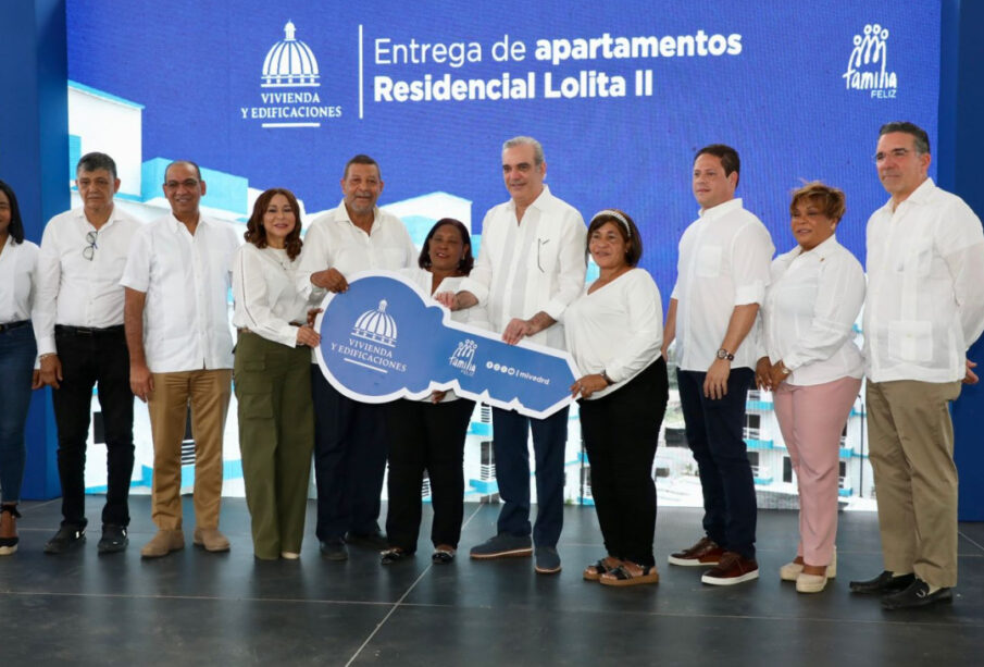 Santo Domingo Oeste.– El presidente Luis Abinader encabezó este sábado la inauguración del Residencial Lolita II, en Hato Nuevo, como parte del Plan Nacional de Viviendas Familia Feliz. Allí se hizo una primera entrega de 140 nuevos apartamentos a igual número de familias, lo cual impacta de manera directa a 560 personas.