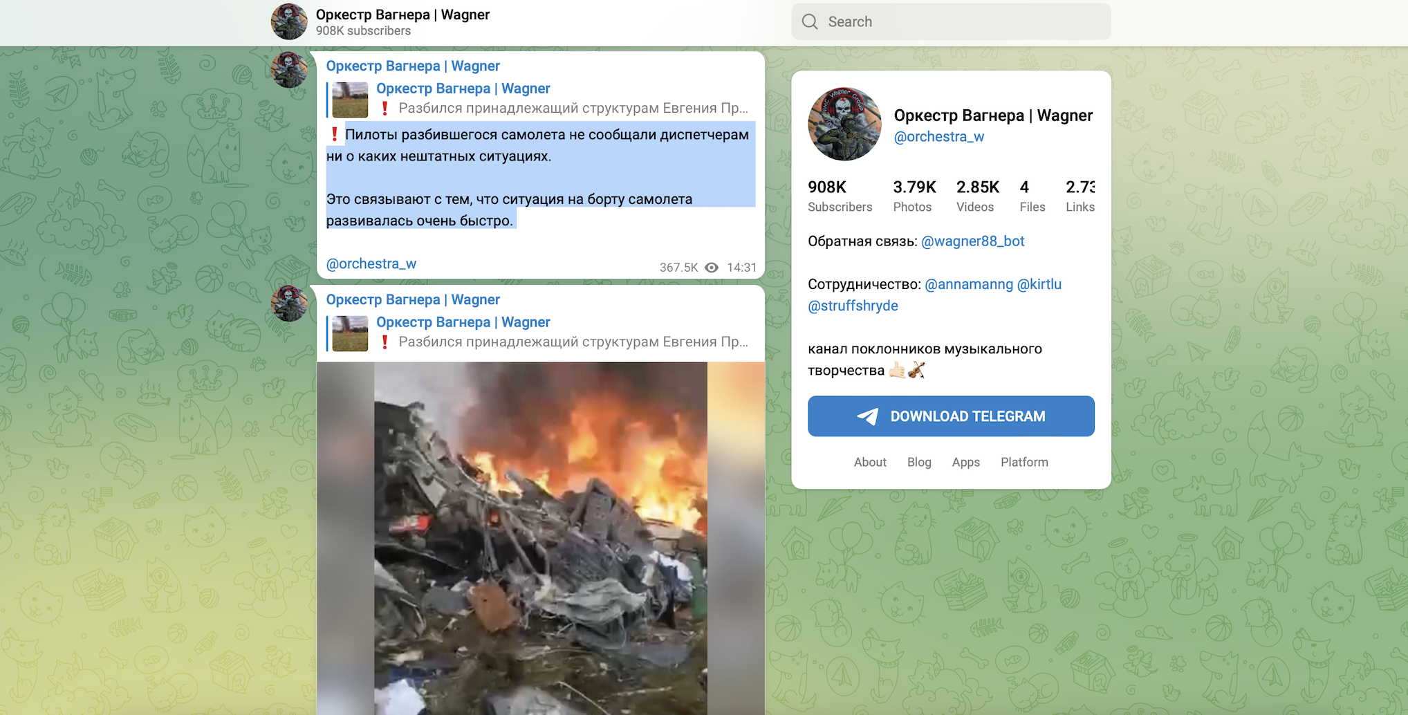 Nueva York: El Canal de Telegram “Orchestra”, cercano al Grupo Wagner, acusa a Rusia de haber derribado el avión de Yevgeny Prigozhin”, quien aparece en la lista de las diez personas que, según el regulador de la aviación de Rusia, Rosaviatsii, subieron a bordo de la aeronave siniestrada.
