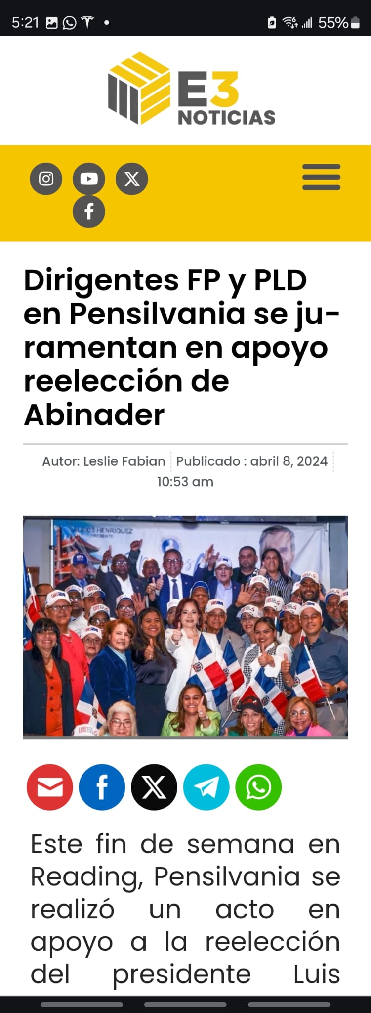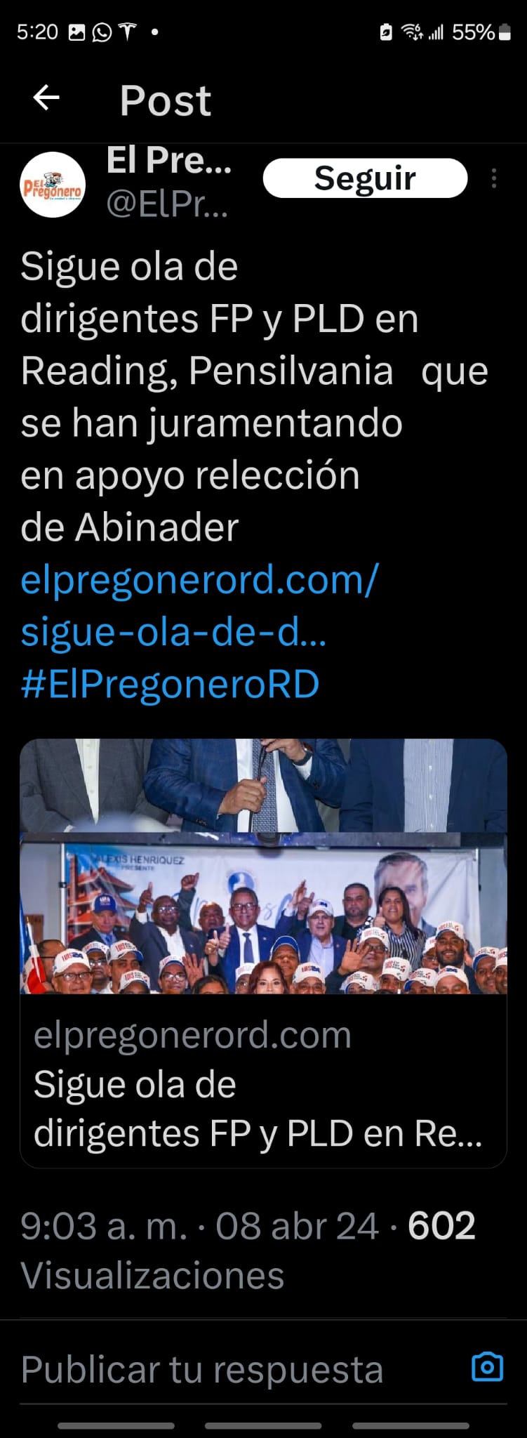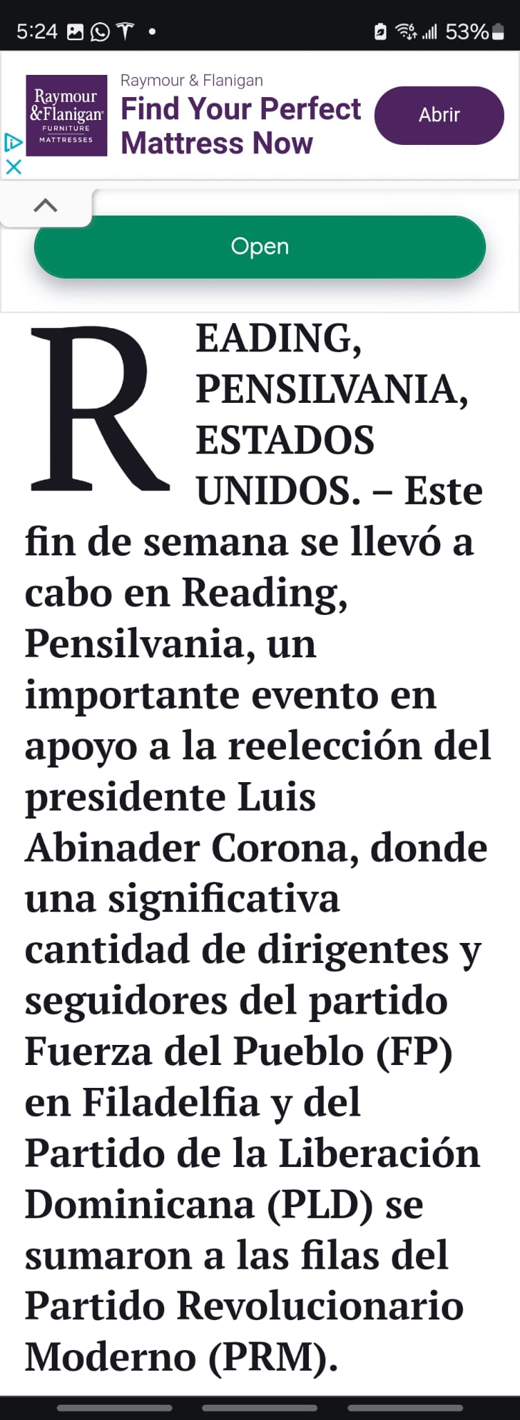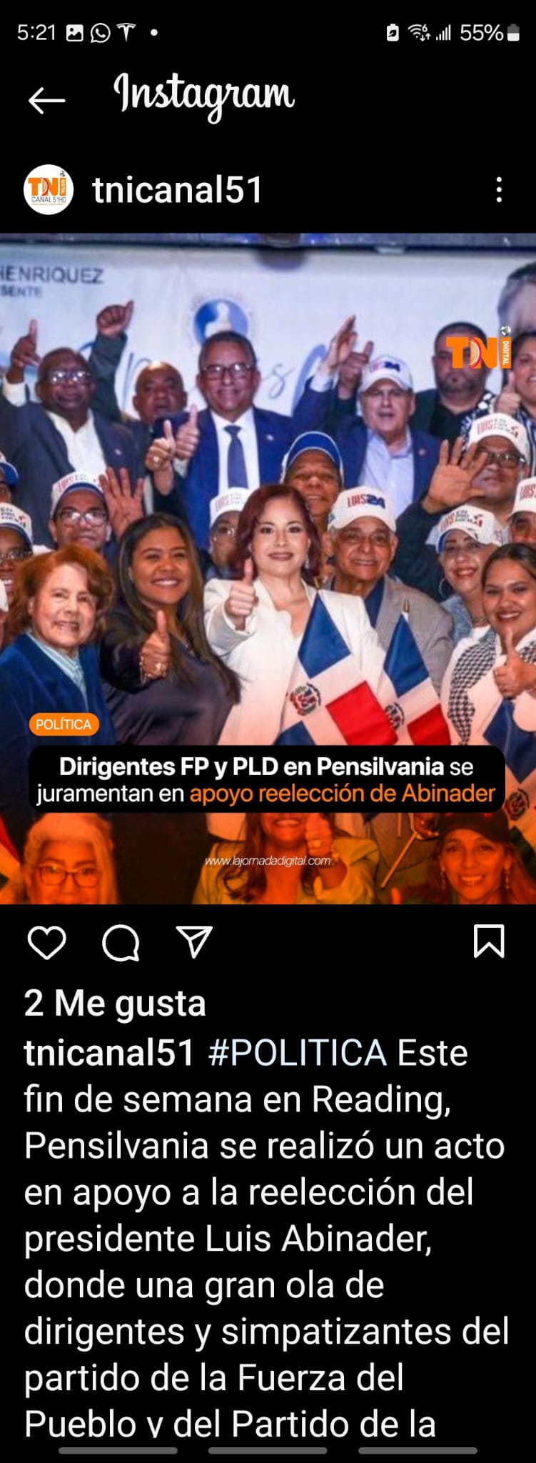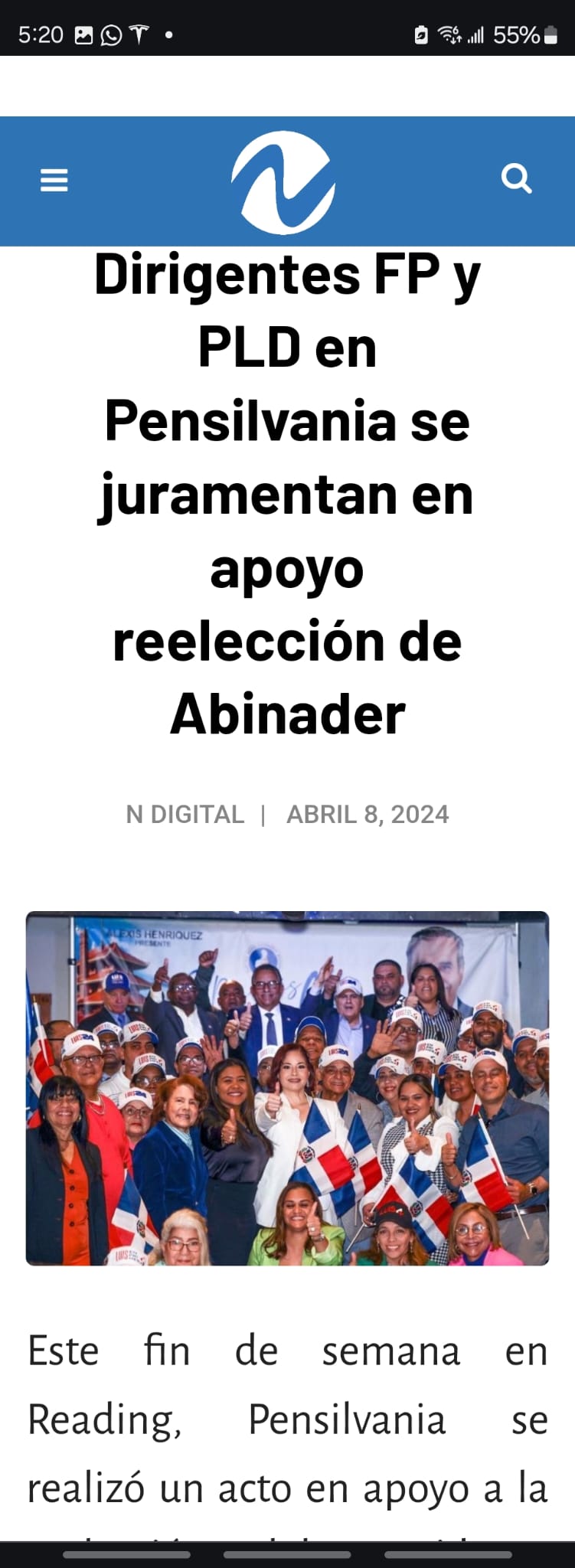 “En otro monumental acto en apoyo a la reelección del presidente Luis Abinader Corona, se produjo este fin de semana en Reading, Pensilvania donde una gran ola de dirigentes y simpatizantes del partido de la Fuerza del Pueblo en Filadelfia y del Partido de la Liberación Dominicana (PLD) pasaron a las filas del Partido Revolucionario Moderno (PRM)”, dijo en su primer párrafo la nota de prensa desplegada masivamente y que los dirigentes de la Fuerza del Pueblo han tildado de un simulacro y la han desmentido categóricamente.