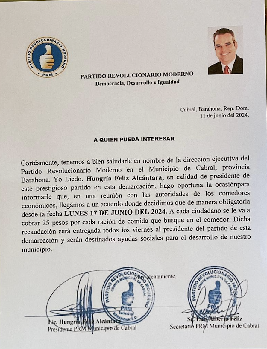 “Cortésmente, tenemos a bien saludarle en nombre de la Dirección Ejecutiva del Partido Revolucionario Moderno en el Municipio de Cabral, provincia Barahona. Yo Licdo. Hungría Feliz Alcántara, en calidad de presidente de este prestigioso partido en esta demarcación, hago oportuna la ocasión para informarle que, en una reunión con las autoridades de los comedores económicos, llegamos a un acuerdo donde decidimos que de manera obligatoria desde la fecha LUNES 17 DE JUNIO DEL 2024. A cada ciudadano se le va a cobrar 25 pesos por cada ración de comida que busque en el comedor. Dicha recaudación será entregada todos los viernes al presidente del partido de esta demarcación y serán destinados ayudas sociales para el desarrollo de nuestro municipio”, reza la carta, que está firmada por el Licdo. Hungría Feliz Alcántara, presidente PRM municipio de Cabral y el Licdo. Alberto Feliz, Secretario del PRM del Municipio de Cabral.