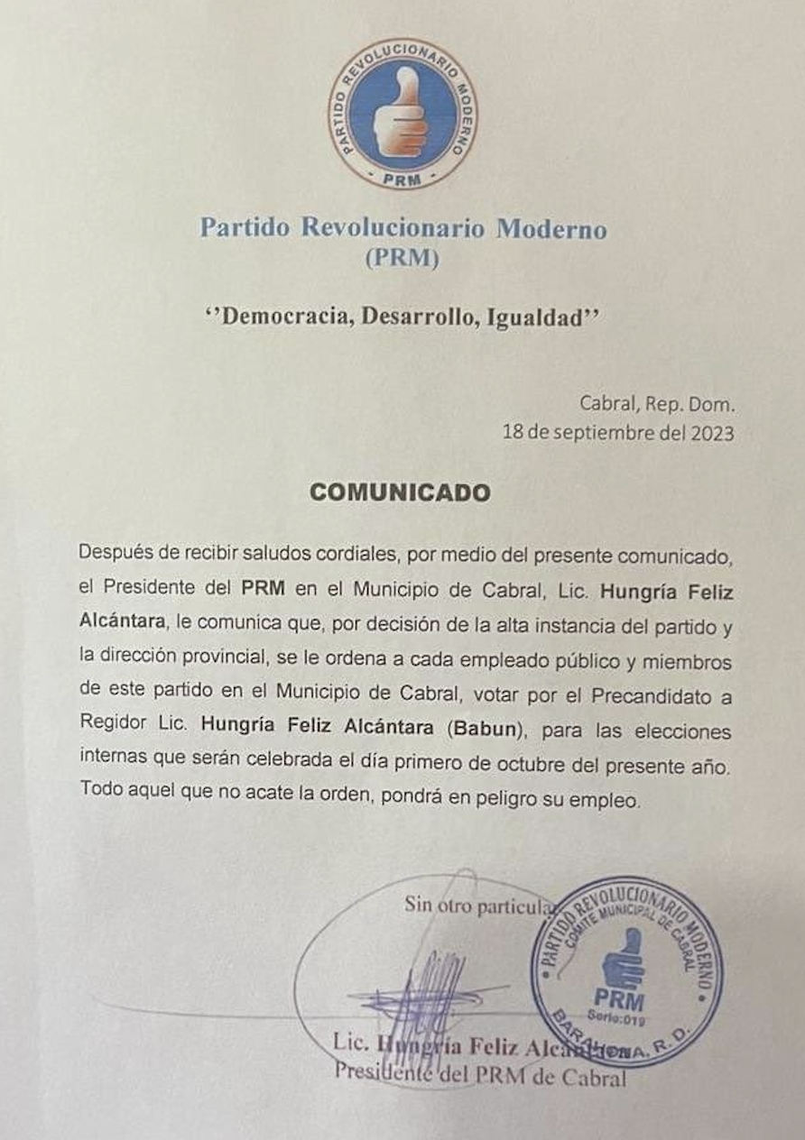 Los denunciantes acompañaron sus declaraciones de una presunta carta que, supuestamente, emitió la Dirección Ejecutiva Municipal del Partido Revolucionario Moderno (PRM) y puesta a circular en los estamentos oficiales del municipio, donde da a conocer la medida, que, según el texto, será puesta en marcha a partir del próximo lunes 17 de junio. El periódico El Faro Latino, no pudo verificar la autenticidad de esa carta de foma independiente.