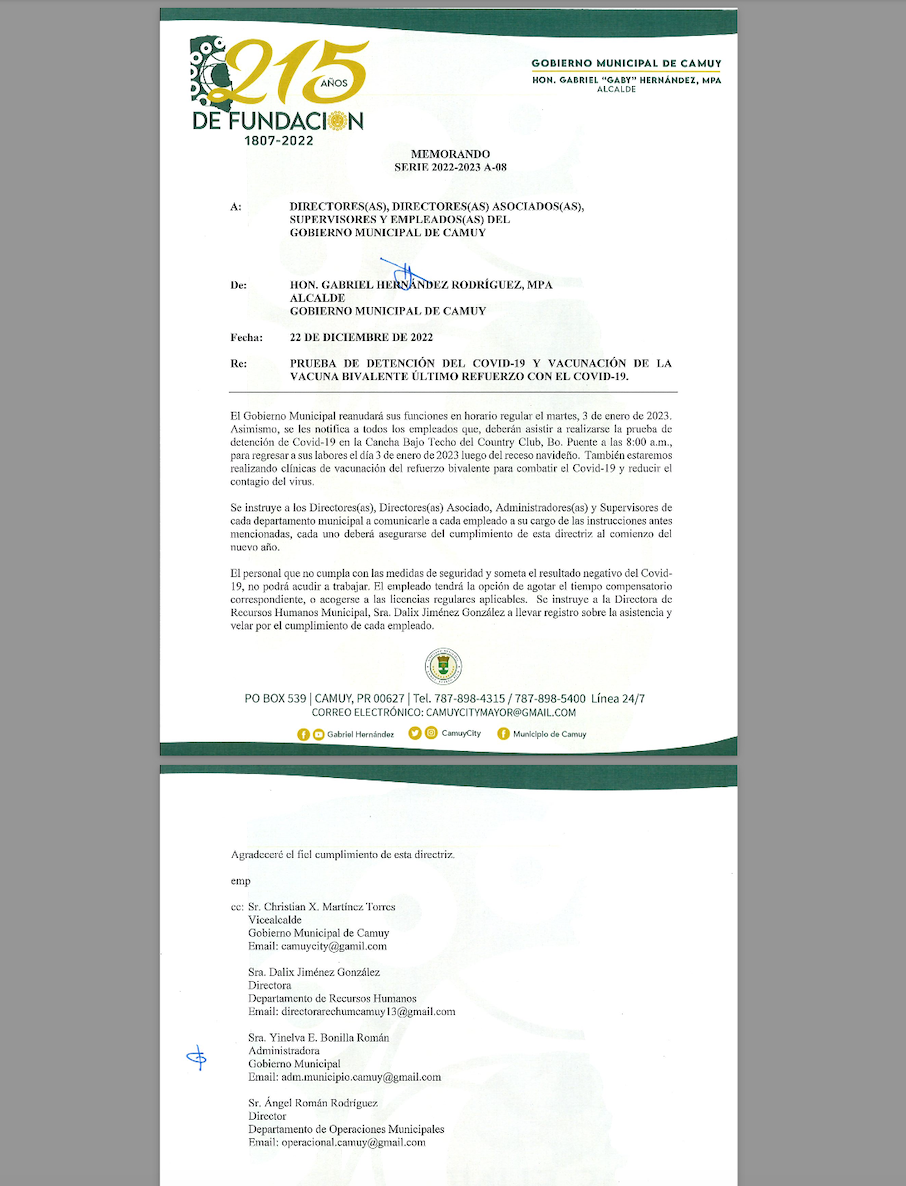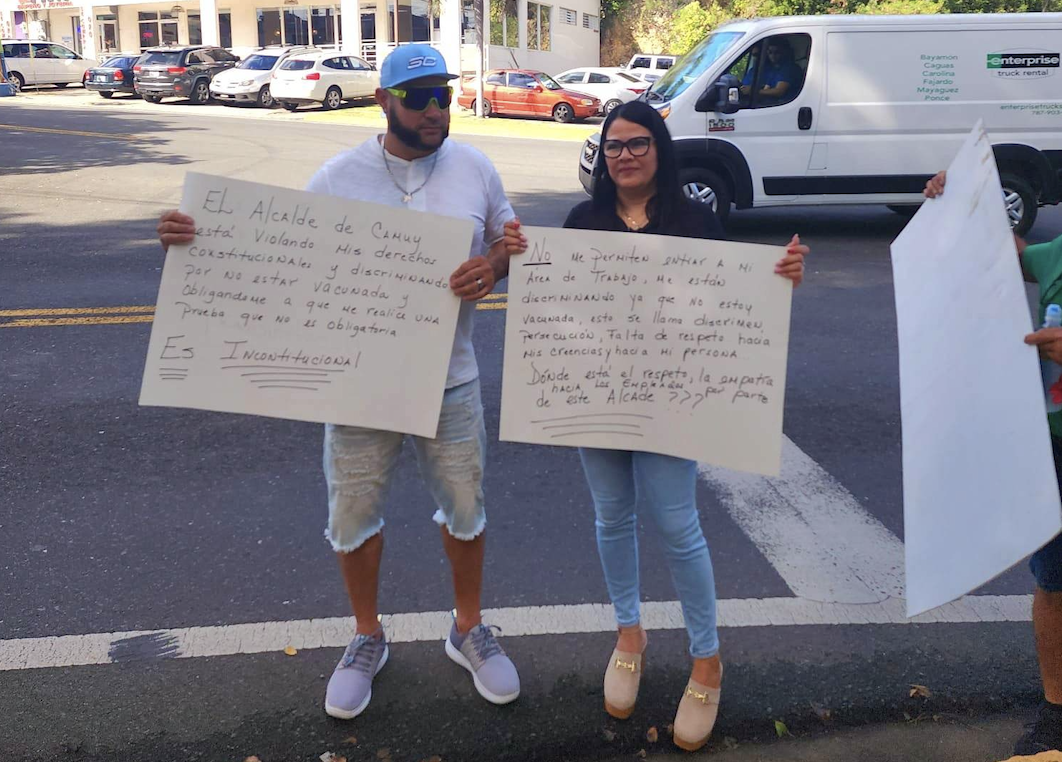 Camuy, P.R: Durante la mañana del pasado lunes, 9 de enero del 2023, Rawell Rivera Feliciano, la portavoz de los empleados del Municipio de Camuy, que no desean vacunarse, ni hacerse pruebas de antígenos, llevó a cabo una protesta junto a otros compañeros, ya que el alcalde de dicho pueblo, Gabriel “Gaby” Hernández, emitió un memorándum indicando que el 2 de enero habría una vacunación y pruebas de COVID-19, donde las personas que no asistieran a realizarse ninguna de las dos opciones tendrían que mantenerse en su hogar, fuera del Ayuntamiento y acogerse a las licencias aplicables y agotar los tiempos compensatorios correspondientes.