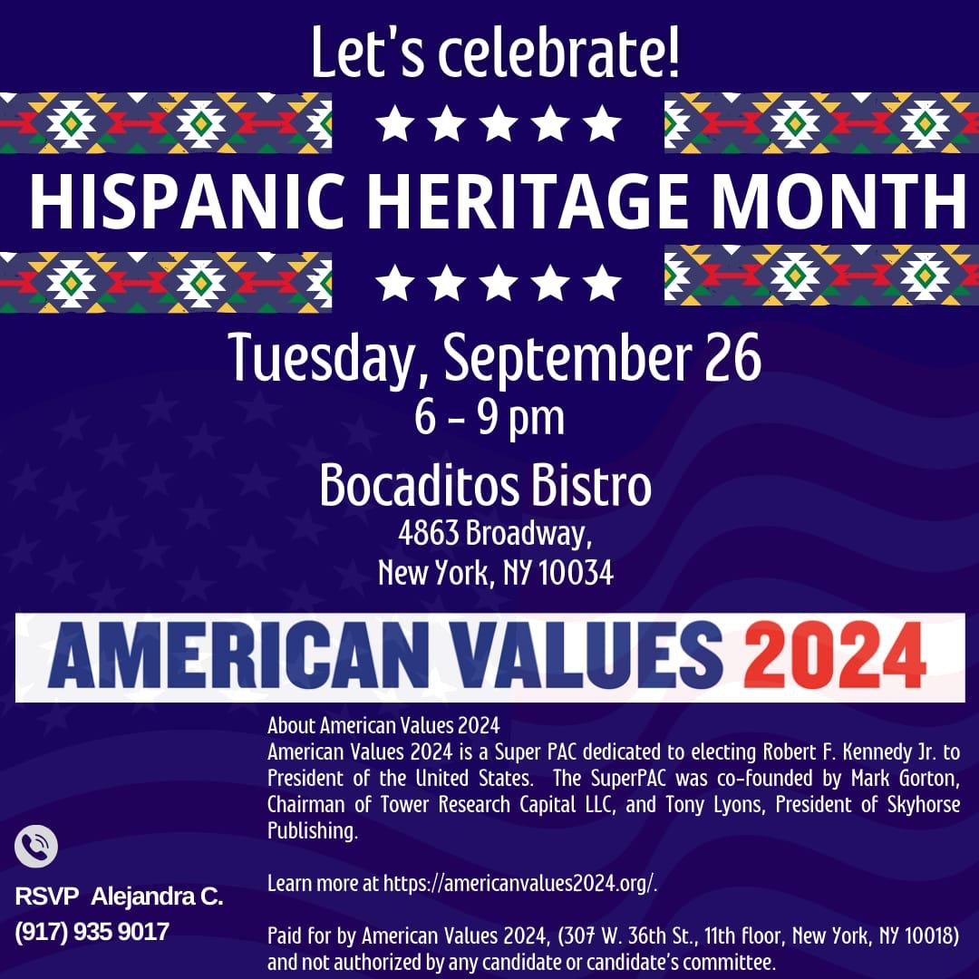New York, NY: El Mes de la Herencia Hispana se ha convertido en una celebración primordial para los latinos que viven y trabajan en USA. Por eso American Values 2024, organización sin fines de lucro que apoya la candidatura de Robert F. Kennedy Jr. ha decidido homenajear y celebrar a los hispanos con un evento especial.