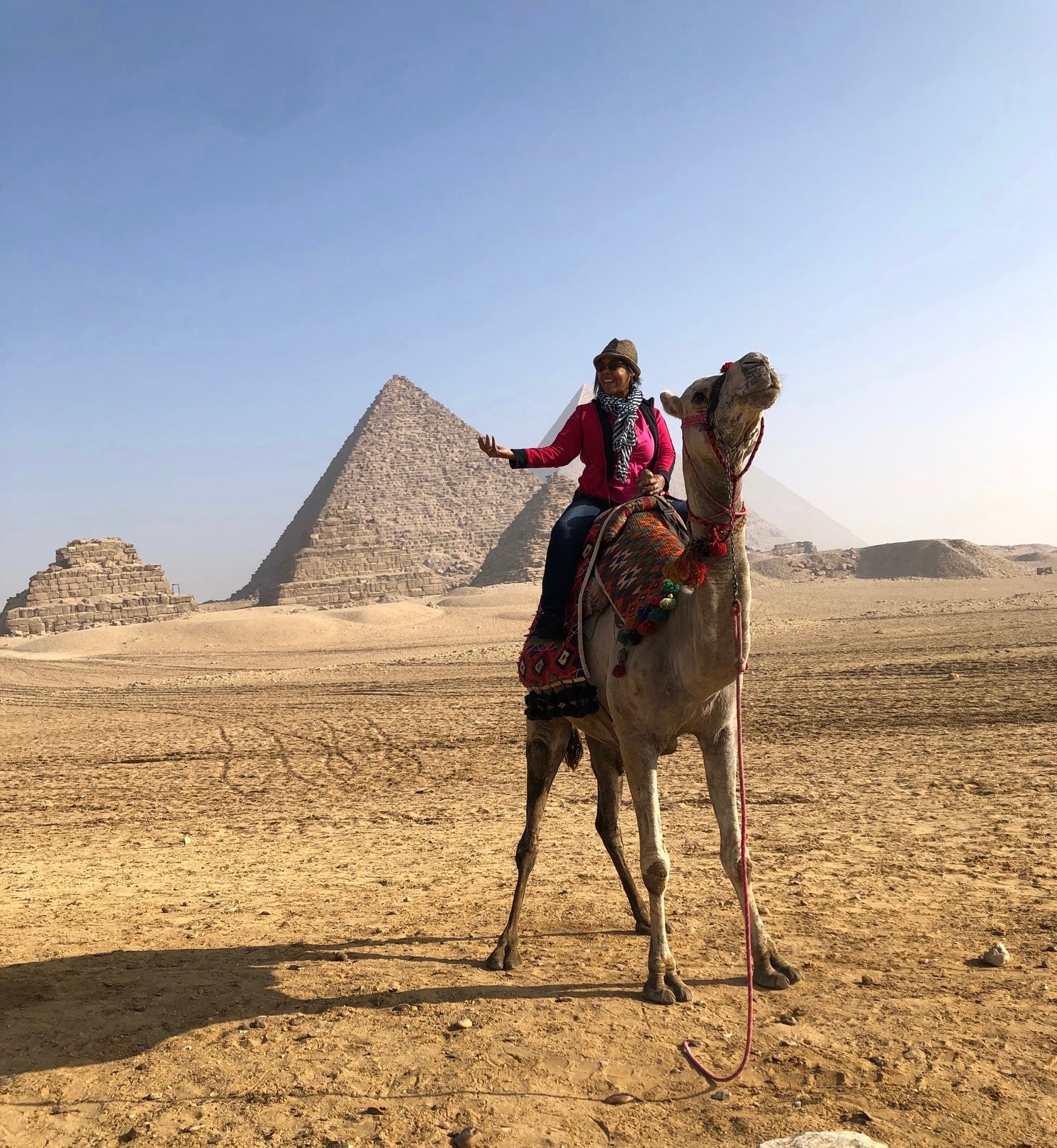 Especialmente, en los últimos viajes estando en Japón, Turquía, Indonesia, Filipinas, Checoslovaquia, Dubai, Arabia Saudi y en Egipto, donde mis amigos me reciben diciendo: “Bienvenida a tu segundo hogar”. Así me quedé dormida observando la escena de Feb 27, 2020 en Egipto antes de la pandemia, allí vi a Alex, mi amigo Camello : allí en su lomo muy alto experimenté el susto ilógico a lo desconocido y la angustia inexplicable; y luego… sentí su calma en la gracia de sus pasos armoniosos, transmitiéndome “todo está bien”. Así en el lomo de Alex y sonriendo me quedé dormida.