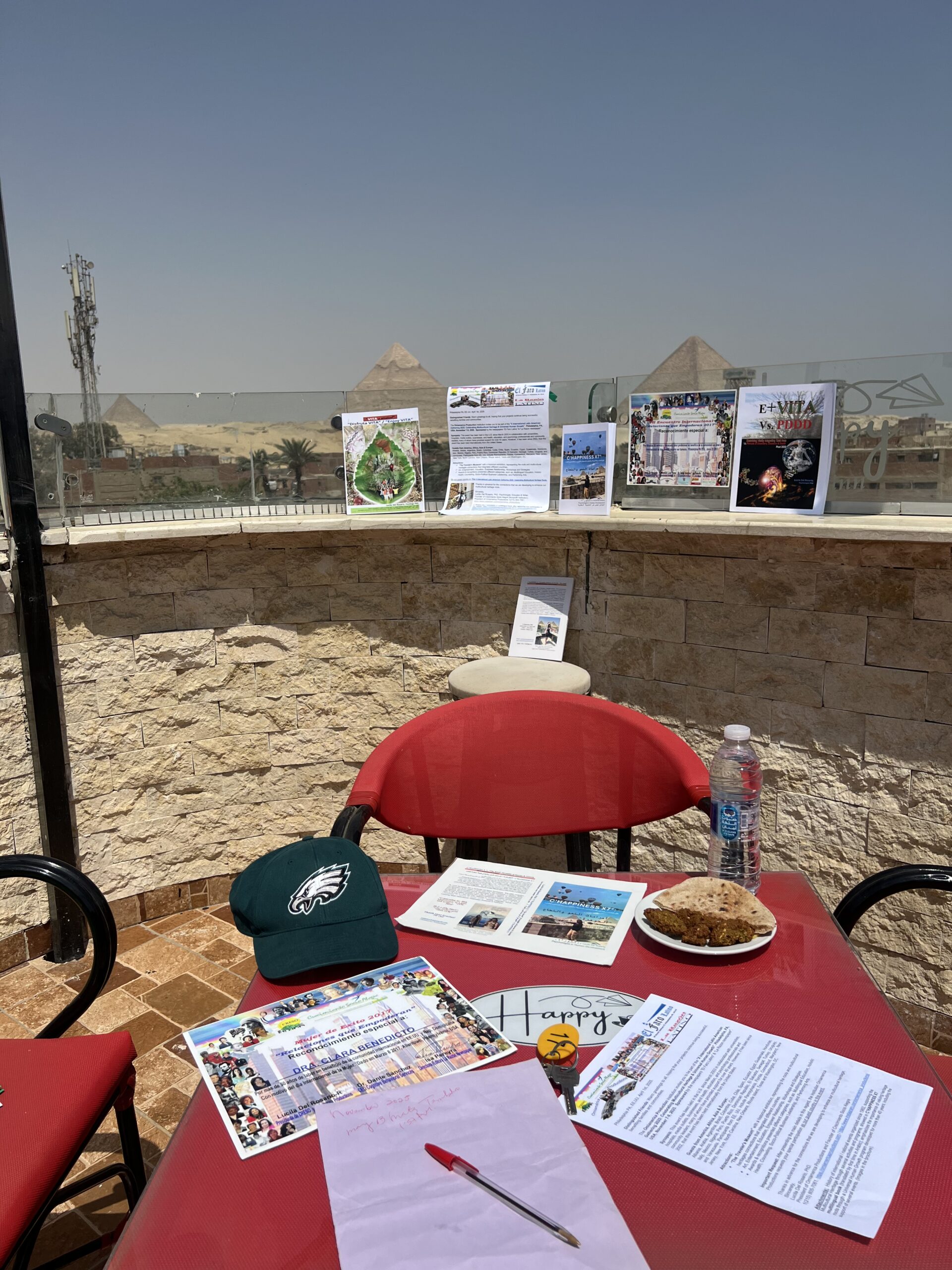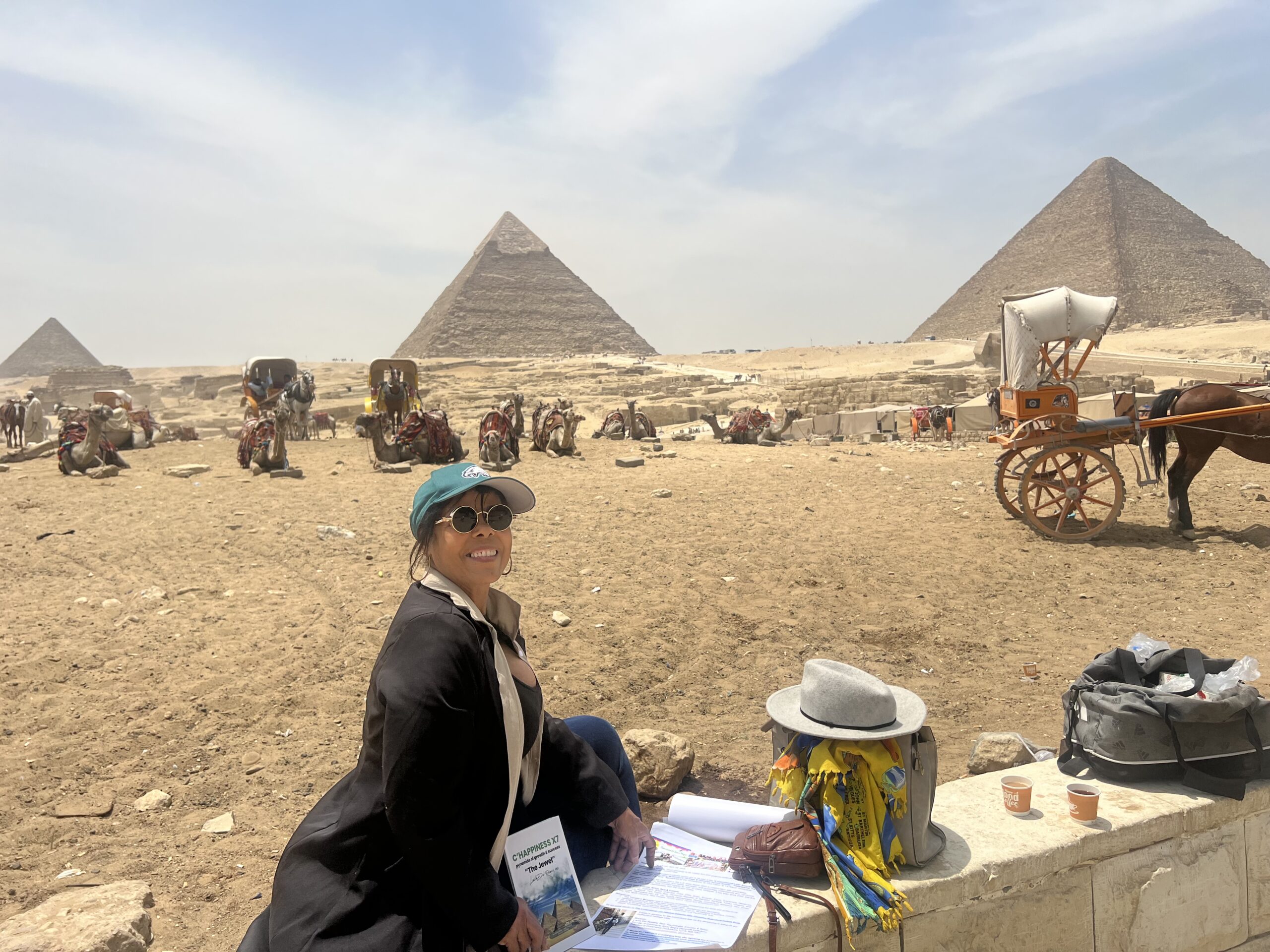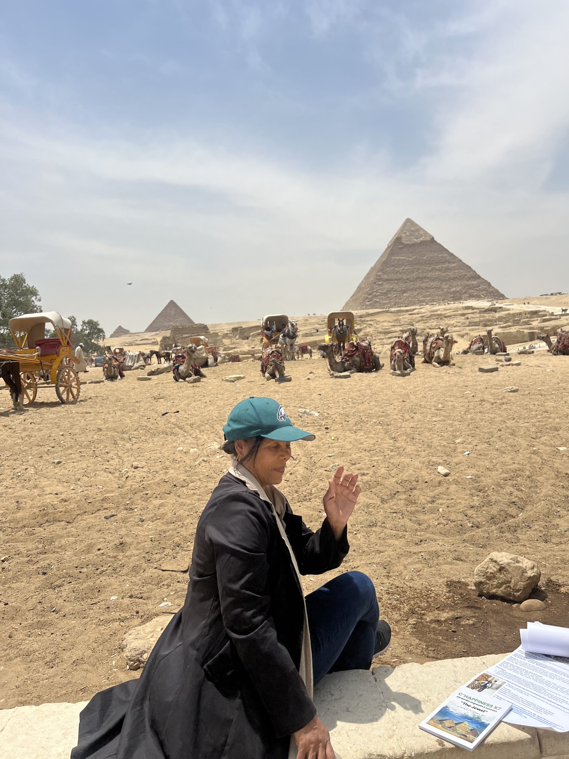 Entonces, mientras disfrutaba mi desayuno, deleitada con la vista de las Pirámides, examiné próximos pasos de misión a seguir. Así que heme aquí, cerca de los adorables camellos, siempre listos para acompañarnos en nuestro viaje y transmitirnos el legado de la calma, la preparación y la fortaleza, soportando nuestro peso en sus lomos en medio de cualquier desierto o devastación, compartiendo “VITA en “PDDD”.