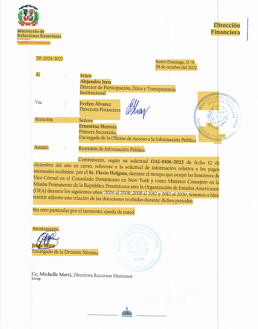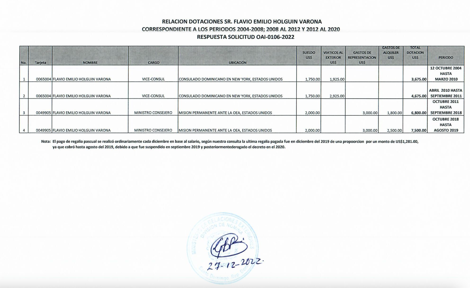 El informe emitido por la Dirección Financiera del MIREX marcado con el número DF-2024-2022 fue levantado por Alejandro Inoa, director de Participación, Ética y Transparencia Institucional, vía Evelyn Álvarez, directora Financiera del MIREX con atención a Ernestina Herrera, primera secretaria, Encargada de la Oficina de Libre Acceso a la Información Pública. Establece que mensualmente, en promedio, Flavio Emilio Holguín Varona, cobró la suma de 5,472.00 dólares, desde 2004 hasta 2020, lo que totaliza la astronómica suma de 957,750 dólares, un total de 54, 782, 000 pesos dominicanos.
