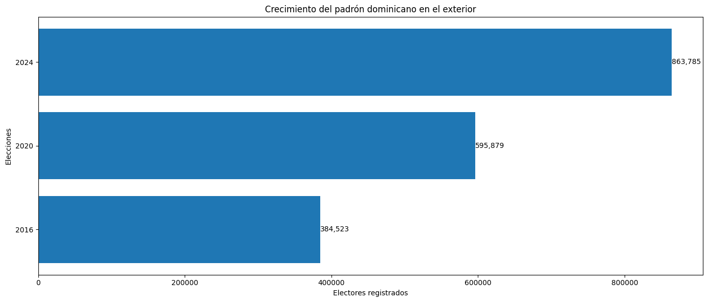For the May 19, 2024 elections, the total voter registry reached 8,145,548 eligible voters. Of that number, 863,785 Dominicans were registered to vote from abroad. According to the Central Electoral Board, if the overseas electorate were considered a domestic district, it would be the second largest in the country, surpassed only by Santo Domingo province and larger than both the National District and Santiago.