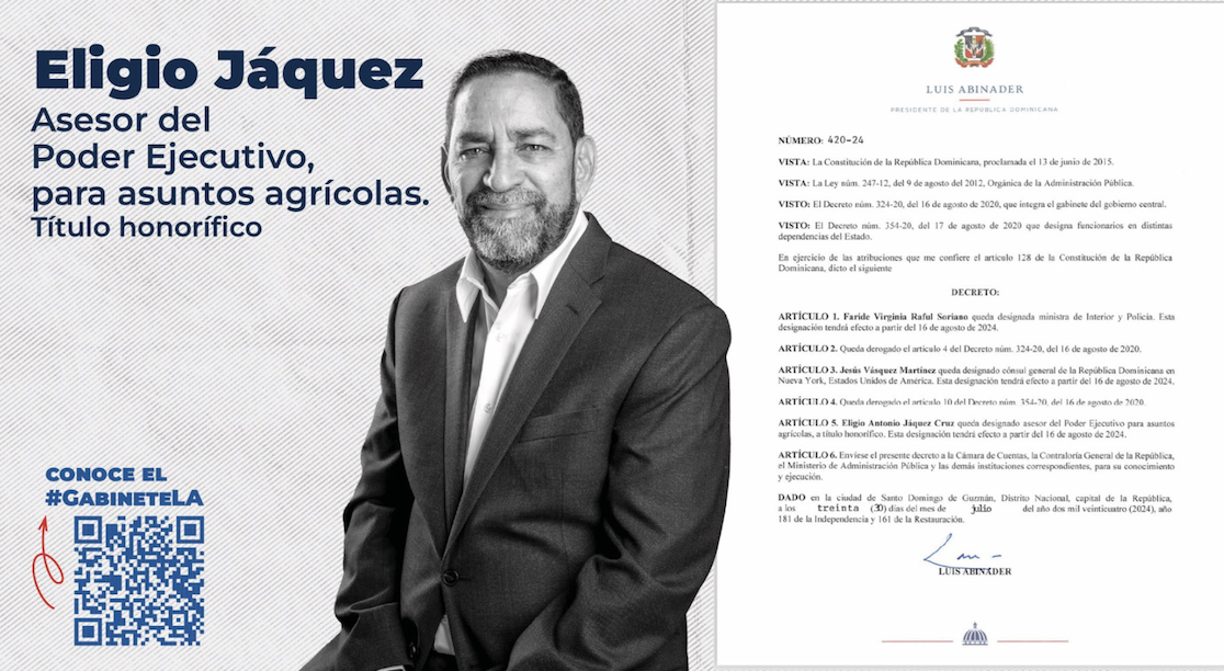 En este mismo decreto, el mandatario designó a Eligio Jáquez como asesor del Poder Ejecutivo para asuntos agrícolas, a título honorífico.