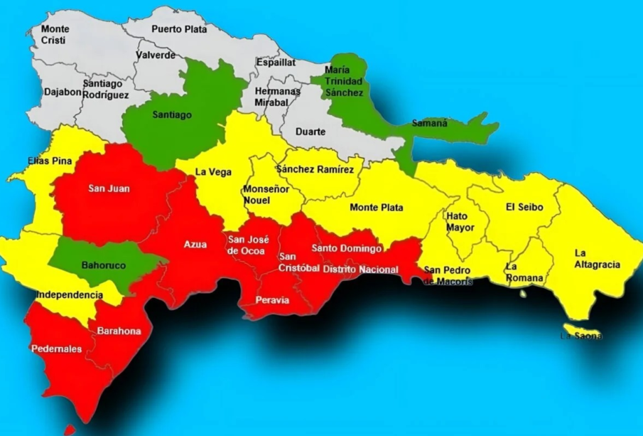 En alerta roja están Santo Domingo, Barahona, San Cristóbal, San José de Ocoa, San Juan, Azua, Peravia, Pedernales y el Distrito Nacional. En Amarilla, La Vega, La Romana, Hato Mayor, El Seibo, San Pedro de Mocorís, Monseñor Nouel, Sánchez Ramírez, La Altagracia, Elías Piña, Monte Plata e Independencia. Y en verde María Trinidad Sánchez, Bahoruco, Samaná y Santiago.