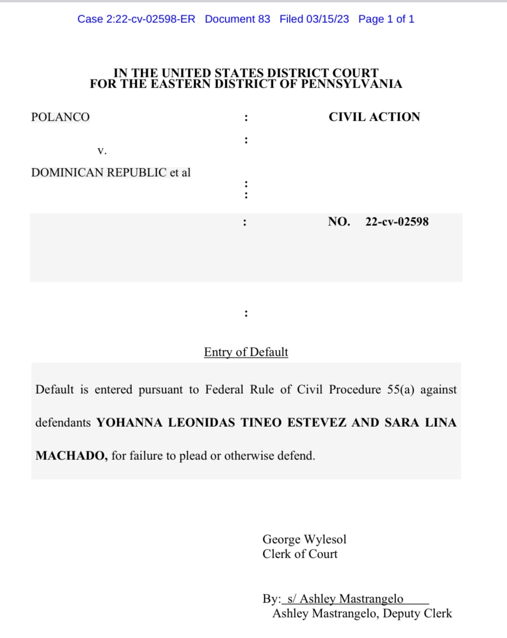 Filadelfia, PA: El Tribunal de Distrito de los Estados Unidos para el Distrito Este de Pennsylvania dictaminó en el marco de la demanda sometida por el Dr. Yomare Polanco/versus La República Dominicana, el Consulado dominicano de NY, miembros del PLD, la JCE y funcionarios, el acto número 22-cv-02598 un incumplimiento contra dos de las imputadas identificadas como Sarah Lina Machado Balbuena, exjueza de la Oficina de Logística para Electores en el Exterior (OCLEE) en Nueva Jersey y Yohanna Leónidas Tineo Estévez, exencargada de la oficina para el Registro de Electores en el Exterior (OPREE) de Paterson, Nueva Jersey.
