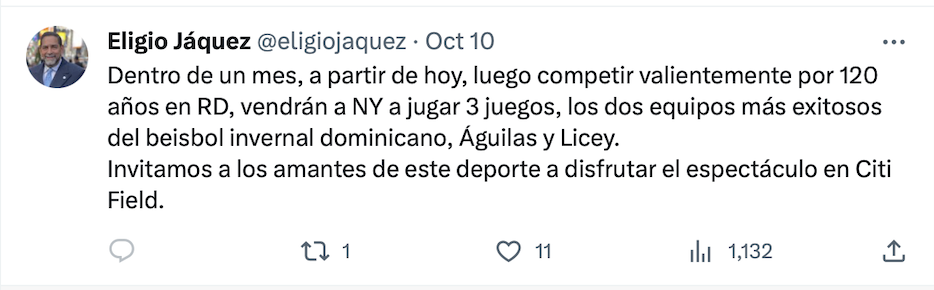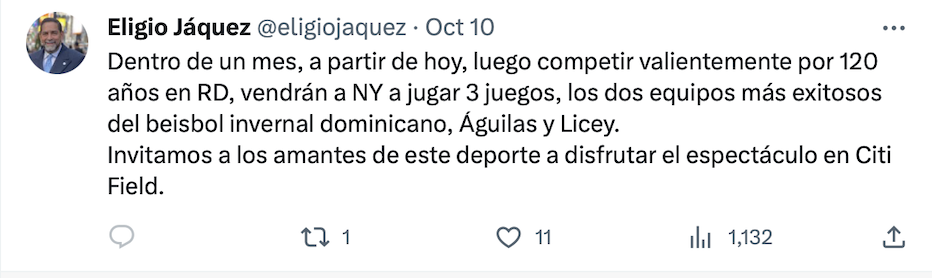 “Dentro de un mes, a partir de hoy, luego de competir valientemente por 120 años en RD, vendrán a NY a jugar 3 juegos, los dos equipos más exitosos del beisbol invernal dominicano, Águilas y Licey. Invitamos a los amantes de este deporte a disfrutar el espectáculo en Citi Field.” Concluyó el cónsul Eligio. Jáquez.