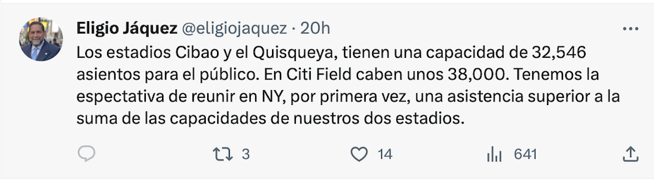 “Los estadios Cibao y el Quisqueya, tienen una capacidad de 32,546 asientos para el público. En Citi Field caben unos 38,000. Tenemos la expectativa de reunir en NY, por primera vez, una asistencia superior a la suma de las capacidades de nuestros dos estadios”, continuó escribiendo Eligio Jáquez.