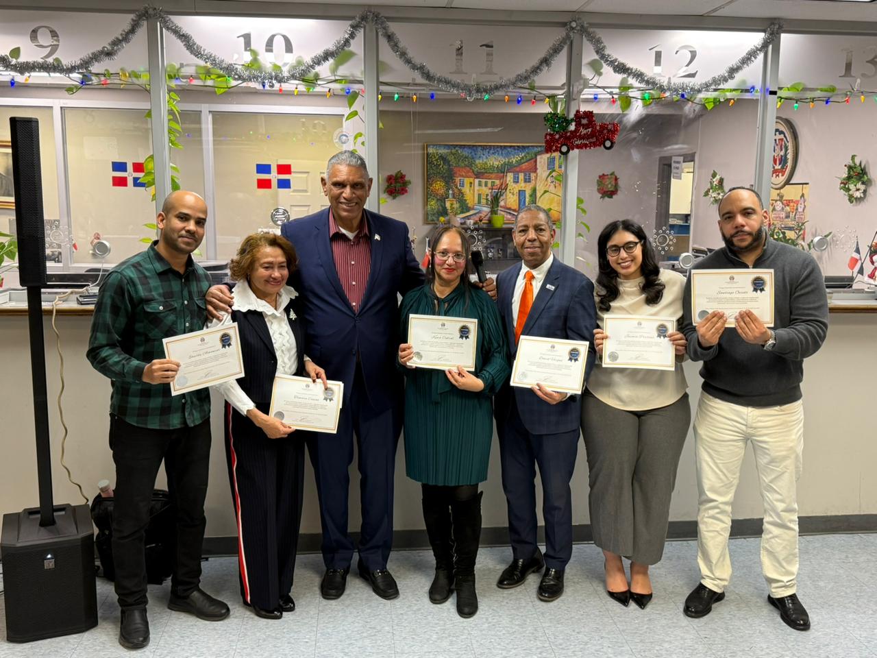 Como parte del ambiente festivo, el Consulado anunció la realización de una rifa navideña de premios para los empleados, entre los que se incluyen un pasaje aéreo ida y vuelta a la República Dominicana, electrodomésticos y otros obsequios, como muestra adicional de agradecimiento.