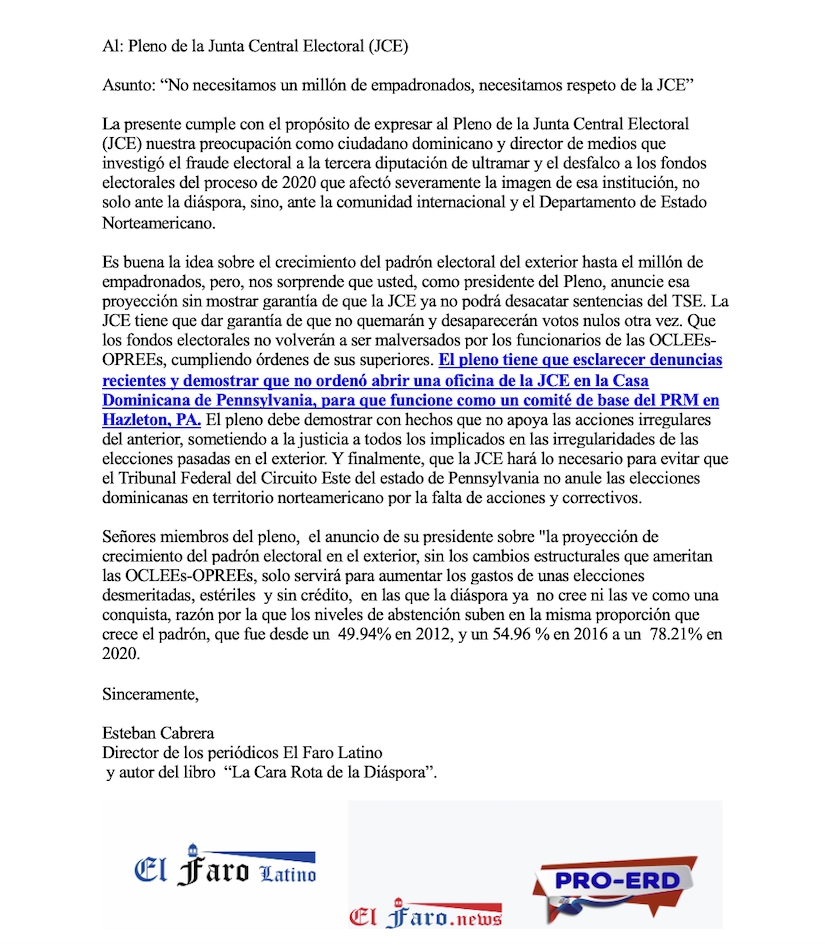 “Es buena la idea sobre el crecimiento del padrón electoral del exterior hasta el millón de empadronados, pero, nos sorprende que usted, como presidente del Pleno, anuncie esa proyección sin mostrar garantía de que la JCE ya no podrá desacatar sentencias del TSE. La JCE tiene que dar garantía de que no quemarán y desaparecerán votos nulos otra vez. Que los fondos electorales no volverán a ser malversados por los funcionarios de las OCLEEs-OPREEs, cumpliendo órdenes superiores. El pleno tiene que esclarecer denuncias recientes y demostrar que no ordenó abrir una oficina de la JCE en la Casa Dominicana de Pennsylvania, para que funcione como un comité de base del PRM en Hazleton, PA. El pleno debe demostrar con hechos que no apoya las acciones irregulares del anterior, sometiendo a la justicia a todos los implicados en las irregularidades de las elecciones pasadas en el exterior. Y finalmente, que la JCE hará lo necesario para evitar que el Tribunal Federal del Circuito Este del estado de Pennsylvania no anule las elecciones dominicanas en territorio norteamericano por la falta de acciones y correctivos”, prosigue diciendo la carta.