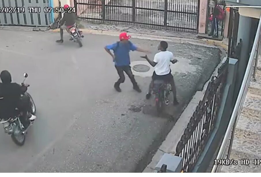 Santiago.-Cámaras de seguridad captaron el momento en el que cuatro individuos armados asaltaron a un hombre para robarle la motocicleta en la que se transportaba. El hecho ocurrió en la calle 2B del barrio Zaida, en el sector Los Santos, en Santiago.