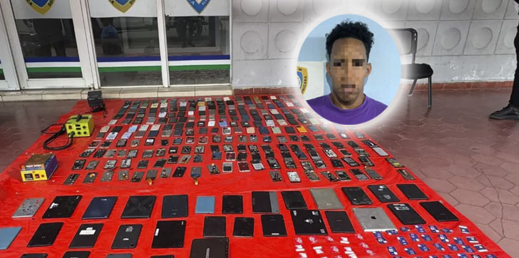 Santiago.- La Policía Nacional arrestó a Jorge Issac Bello de Jesús, alias “La Para”, durante un allanamiento en el sector Las Ceibitas, en Pekín, al sur de Santiago, donde se incautaron más de 150 celulares y decenas de equipos electrónicos presuntamente robados.