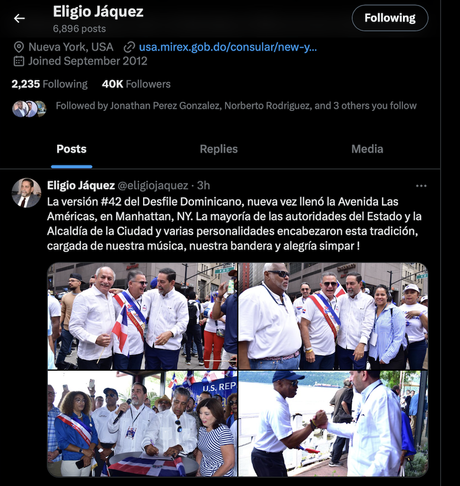 “La versión #42 del Desfile Dominicano, nuevamente llenó la Avenida Las Américas, en Manhattan, NY. La mayoría de las autoridades del Estado y la Alcaldía de la Ciudad y varias personalidades encabezaron esta tradición, cargada de nuestra música, ¡nuestra bandera y alegría simpar!”, colgó Eligio Jáquez en su cuenta de x la tarde de este domingo 11 de agosto.