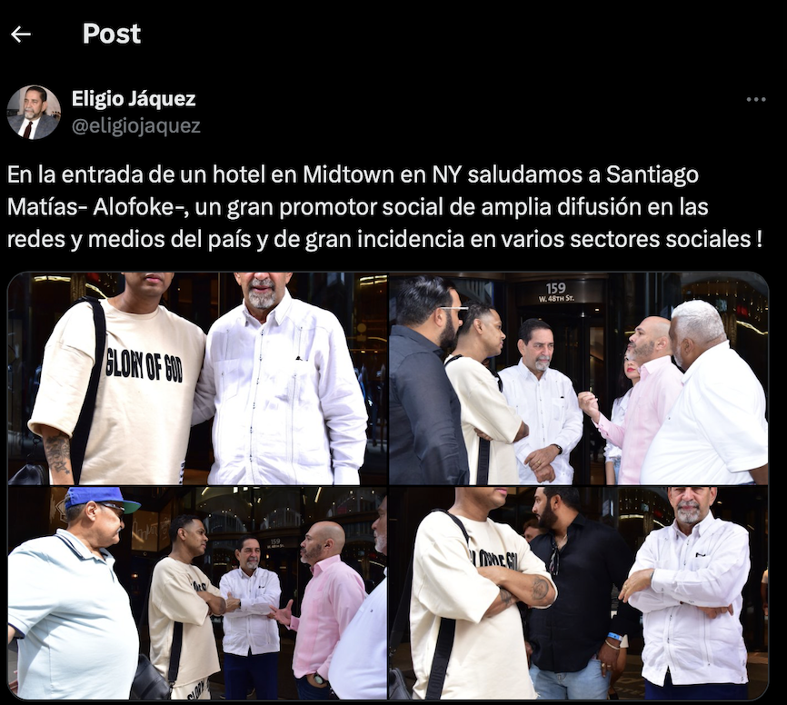 “¡En la entrada de un hotel en Midtown en NY saludamos a Santiago Matías- Alofoke-, un gran promotor social de amplia difusión en las redes y medios del país y de gran incidencia en varios sectores sociales!” volvió a publicar en X el cónsul Jáquez.