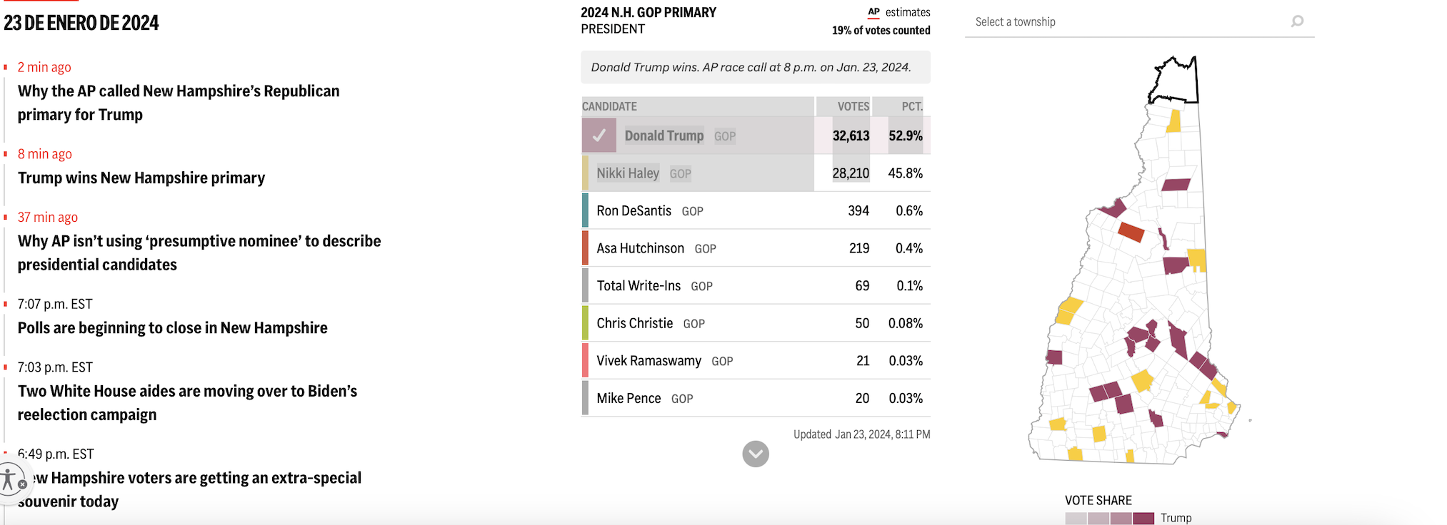 Los resultados iniciales de más de 25 municipios mostraron que Trump lideraba por un cómodo margen a las 8 p.m. Esto incluye resultados de Manchester y Concord, dos de las tres ciudades más pobladas del estado. También se informó de retornos tempranos desde zonas más rurales del norte y el este del estado. Todos confirmaron los hallazgos de la encuesta de AP.