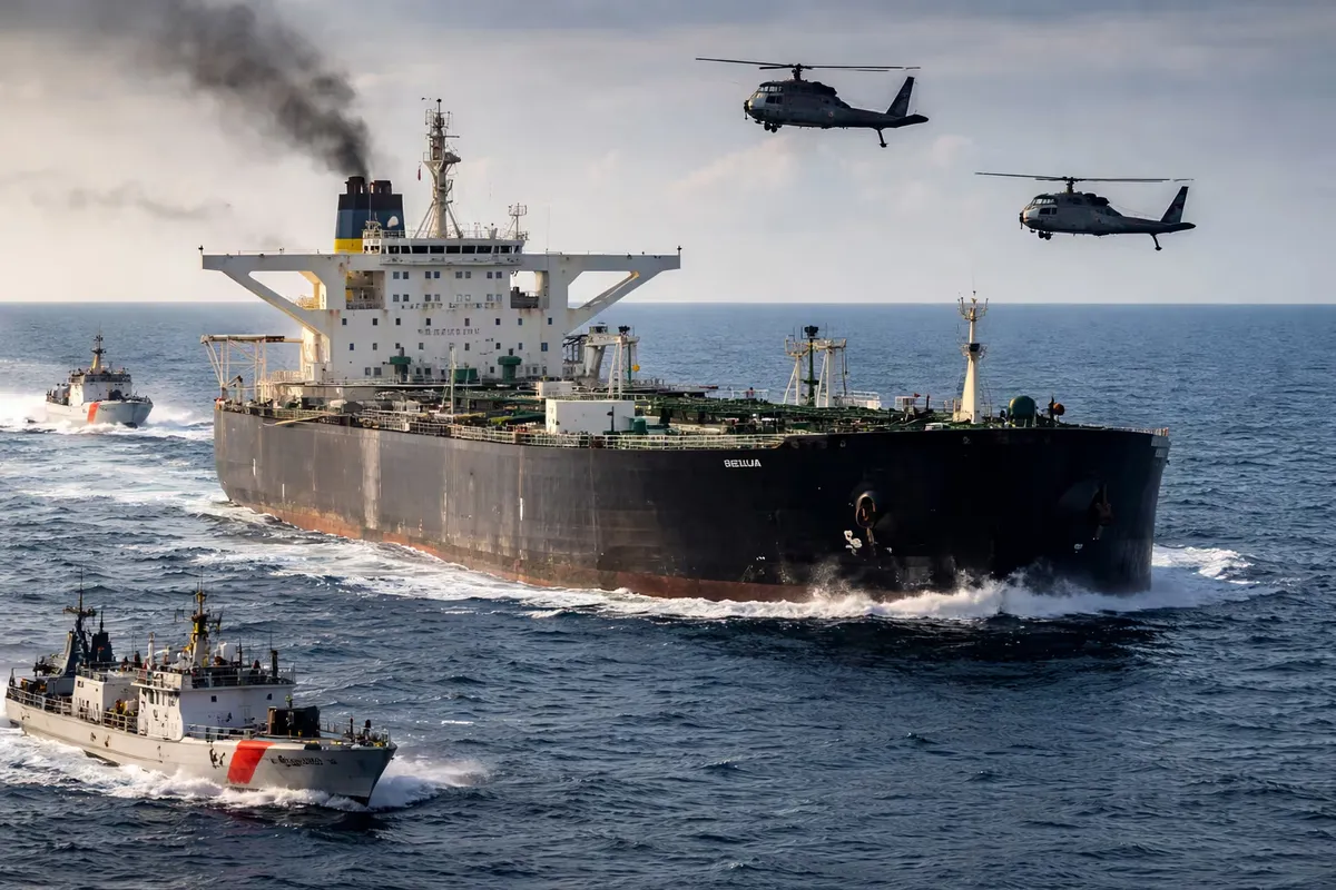 El contexto inmediato es la orden anunciada por Donald Trump el 16 de diciembre de 2025, presentada como un bloqueo total contra petroleros sancionados que entren o salgan de Venezuela. Reuters documentó esa directriz y el debate legal que abre cuando se ejecuta lejos del Caribe.