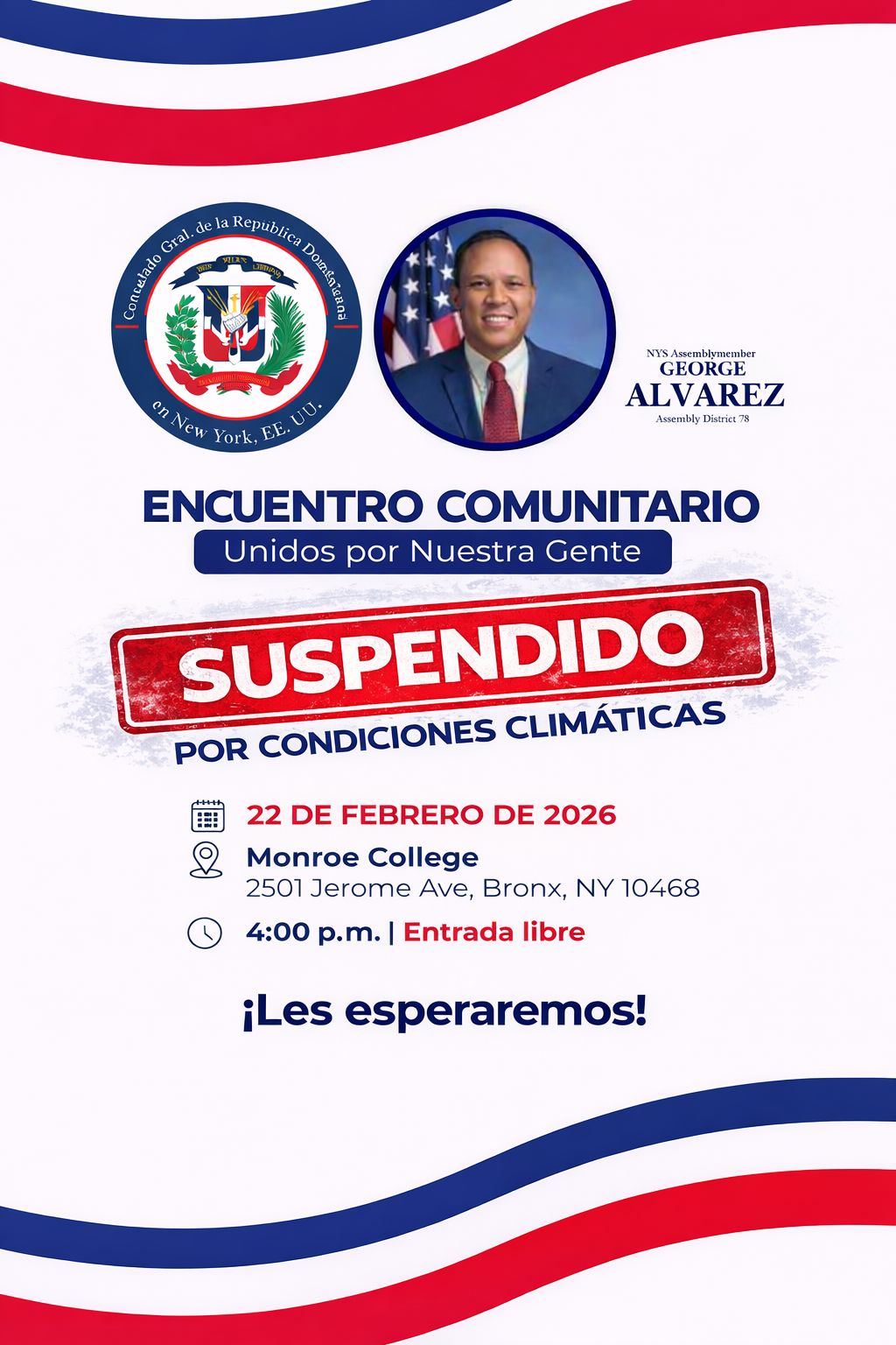 Nueva York. El Consulado General de la República Dominicana en Nueva York informó que el Encuentro Comunitario Unidos por Nuestra Gente, previsto para celebrarse el domingo 22 de febrero de 2026 en Monroe College, ha sido suspendido debido a condiciones climáticas adversas.
