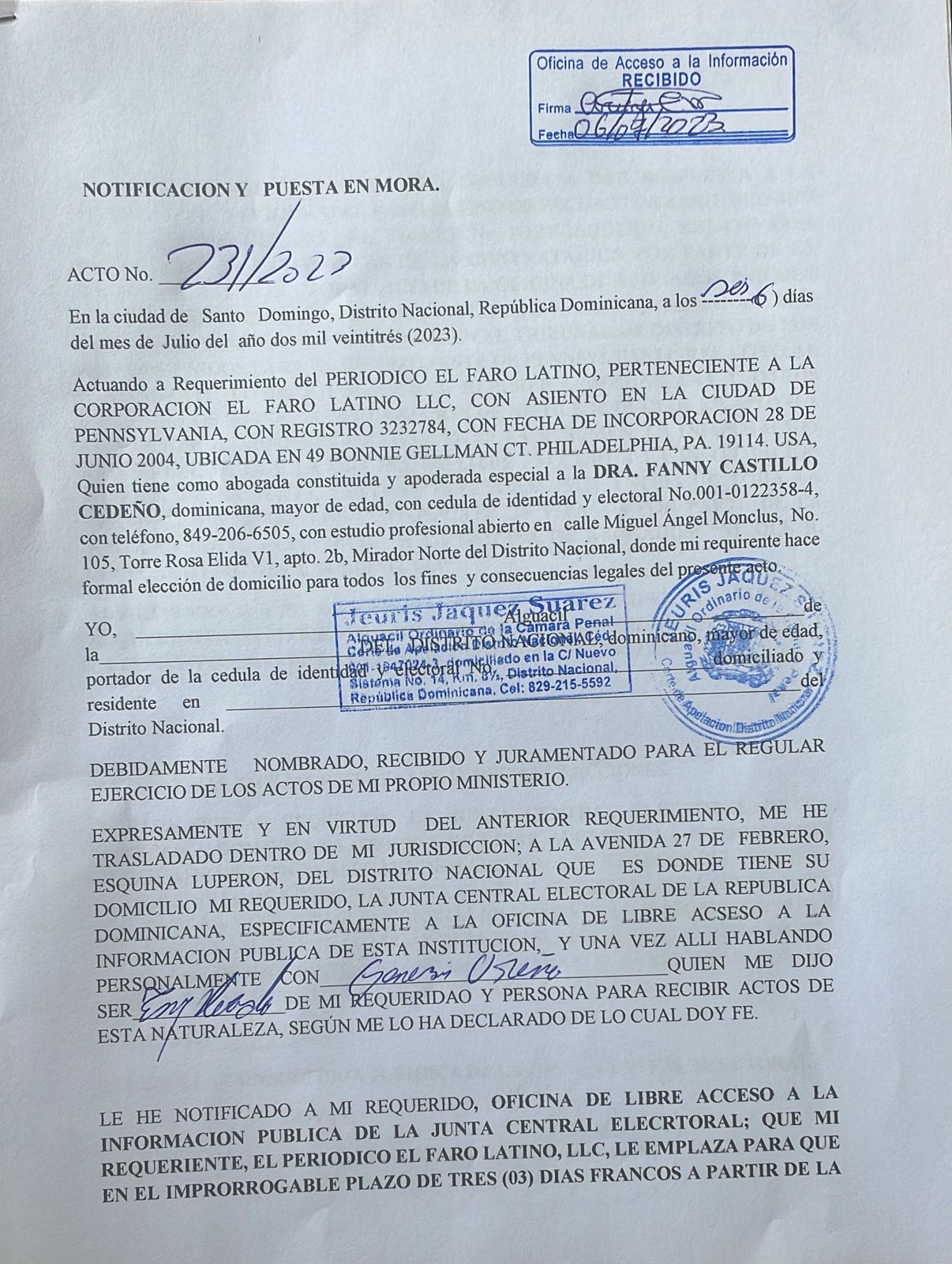 El viernes 6 de julio, 2023, actuando a requerimiento del periódico El Faro Latino, mediante el acto de alguacil #737/2527, el ministerial, Jeuris Jáquez Suarez, notificó en mora a la Junta Central Electoral (JCE) mediante la Oficina de Libre Acceso a la Información Pública, para que en un plazo no menor de tres días francos, la JCE entregue las información requeridas, advirtiéndole que se reserva el derecho de agotar todos los recursos legales de los que dispone la ley si no obtempera al pedido.