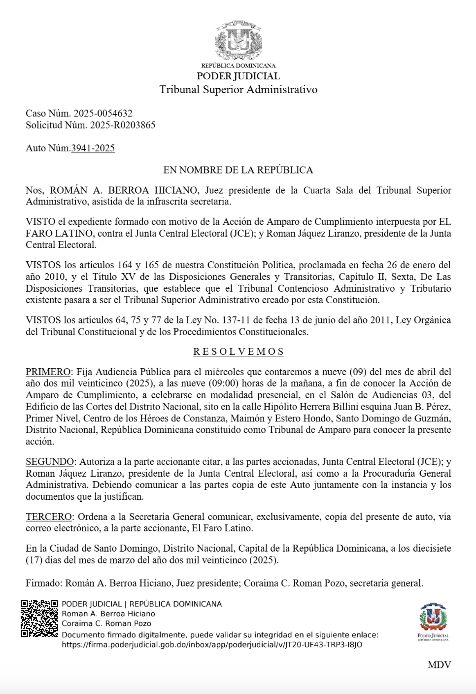 Considering the resolution, based on Articles 164 and 165 of the 2010 Constitution of the Dominican Republic, the Administrative Superior Court (TSA) has set the Public Hearing for Wednesday, April 9, 2025. It has authorized El Faro Latino (the claimant) to notify the defendant parties, namely the Central Electoral Board, its president, Román Andrés Jáquez Liranzo, as well as the Attorney General of the Administration, and to deliver them a copy of this order along with the petition and supporting documents.