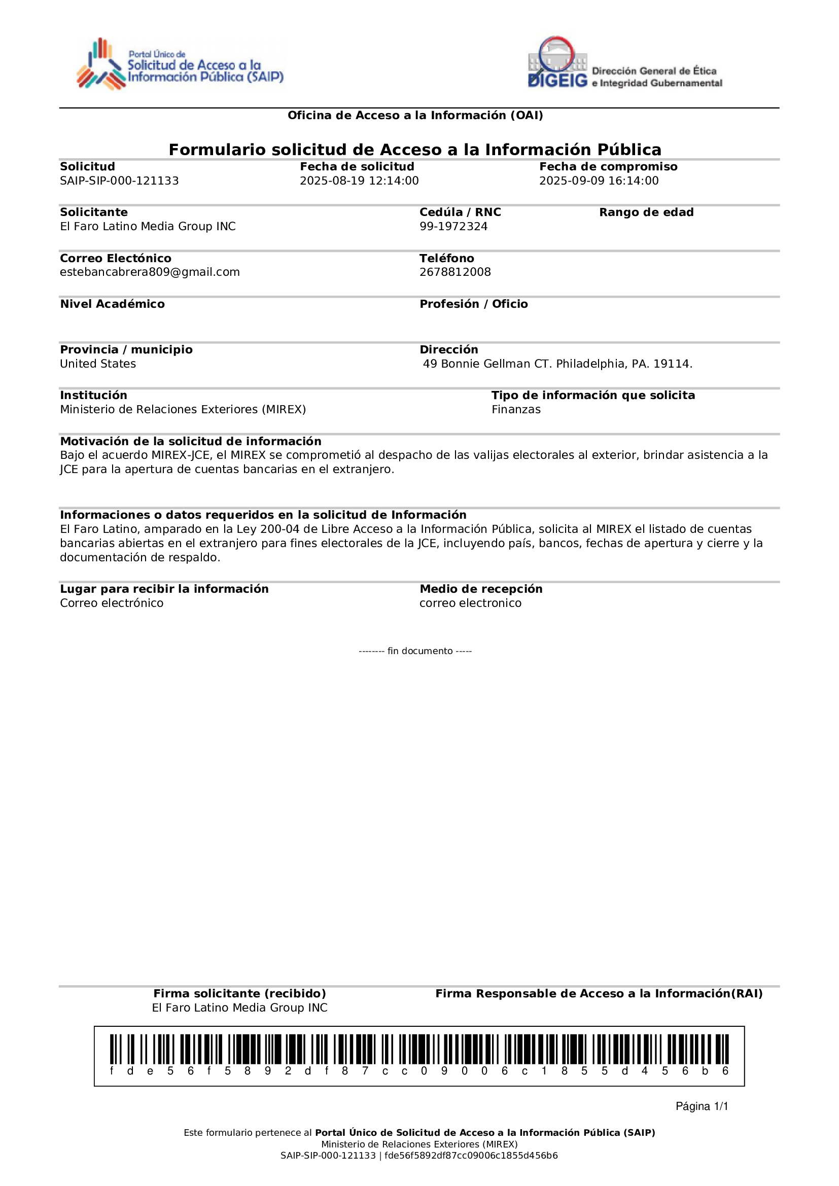Nueva York: En una acción sin precedentes, el periódico El Faro Latino solicitó la mañana del martes 19 de agosto al Ministerio de Relaciones Exteriores (MIREX) de la República Dominicana, en virtud de la Ley de Libre Acceso a la Información Pública (Ley 200-04), que proporcione todos los detalles relacionados con cuentas bancarias abiertas en nombre del MIREX y destinadas a la Junta Central Electoral (JCE) en el exterior.