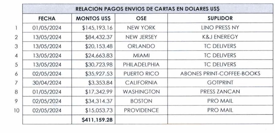 Por otro lado, la Junta Central Electoral (JCE) nos proporcionó la documentación con los nombres de las supuestas empresas y montos que recibieron en la Unión Europea para enviar cartas a los electores dominicanos relativas a las elecciones pasadas del 19 de mayo 2024 que ascendió a la suma de €122,588.61 Euros. Cuando se pasan los euros a dólares a la tasa actual, el total de los pagos realizados para envíos de cartas superaron los US$ 543,582.66, expresado en la moneda de RD son: $32,343,168.30 millones de pesos dominicanos, que un país pobre como RD supuestamente pagó en envíos de cartas, cuyas informaciones estaban servidas en las redes sociales gratis, páginas oficiales, periódicos electrónicos y en los portales de los partidos políticos para que los electores se verificaran.