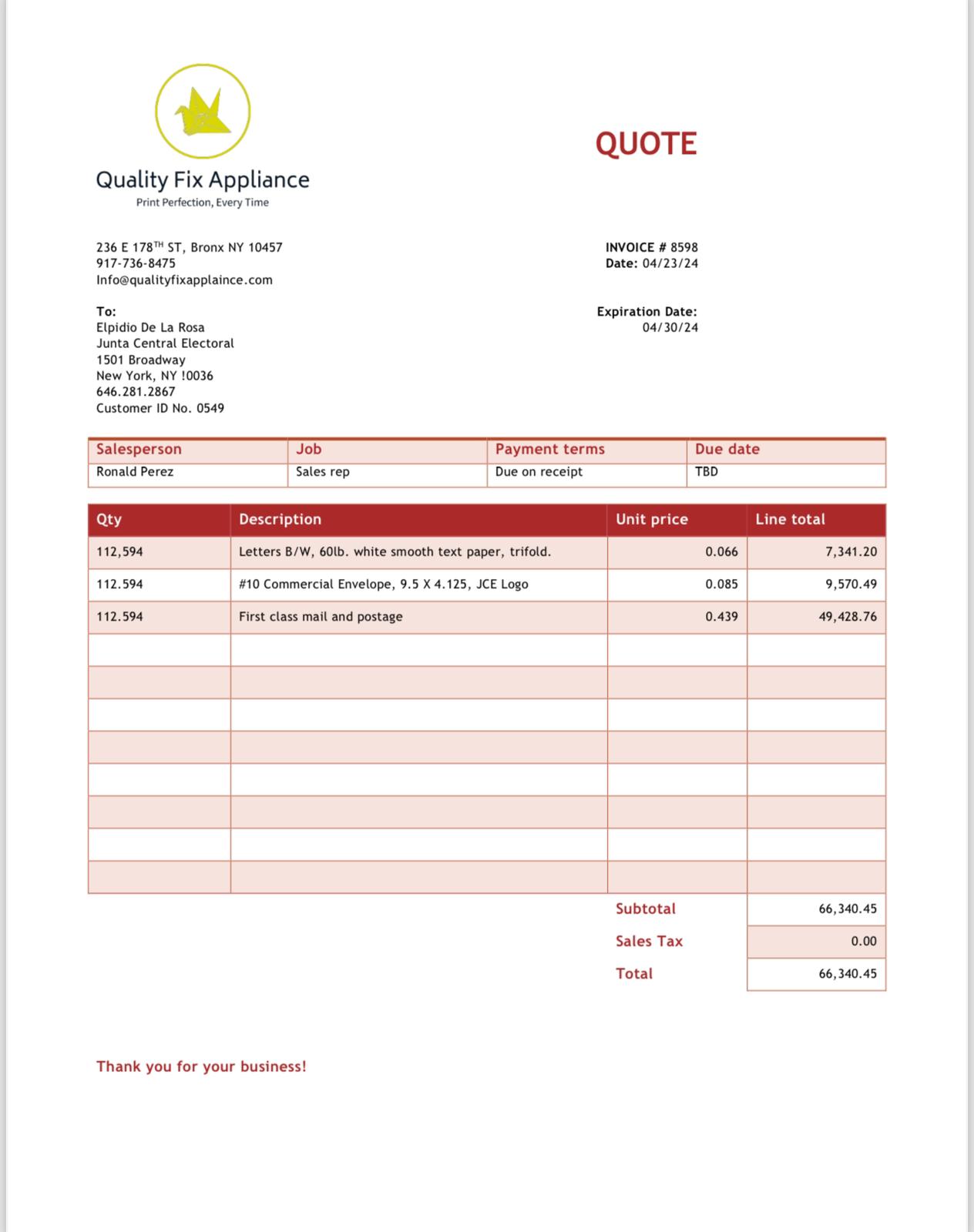 - Copia de factura entre la supuesta empresa, Quality Fix Appliance y la JCE