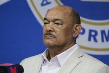 El presidente señaló un escenario detrás de él donde estaban sentados varios oficiales de policía.