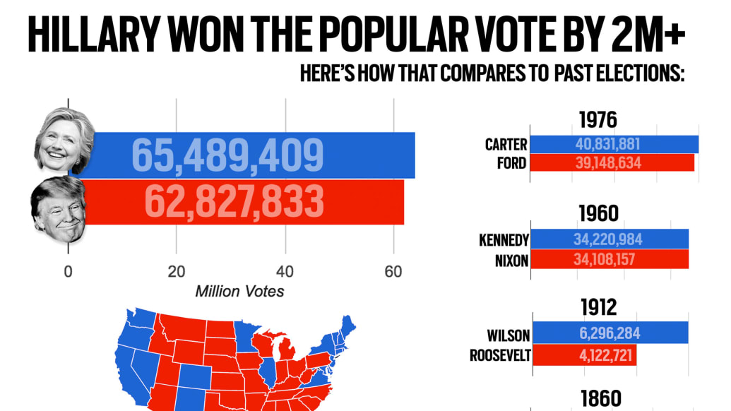 Por ejemplo, en las elecciones presidenciales del 2016 donde se enfrentaron el candidato republicano, Donald Trump y la demócrata Hillary Clinton. Esta última ganó el voto popular con  65.844.95 contra Trump, que alcanzó  62.979.879. Sin embargo, este último fue declarado ganador de las elecciones con 306 votos electorales;  en contraposición de los 232  que obtuvo Clinton.