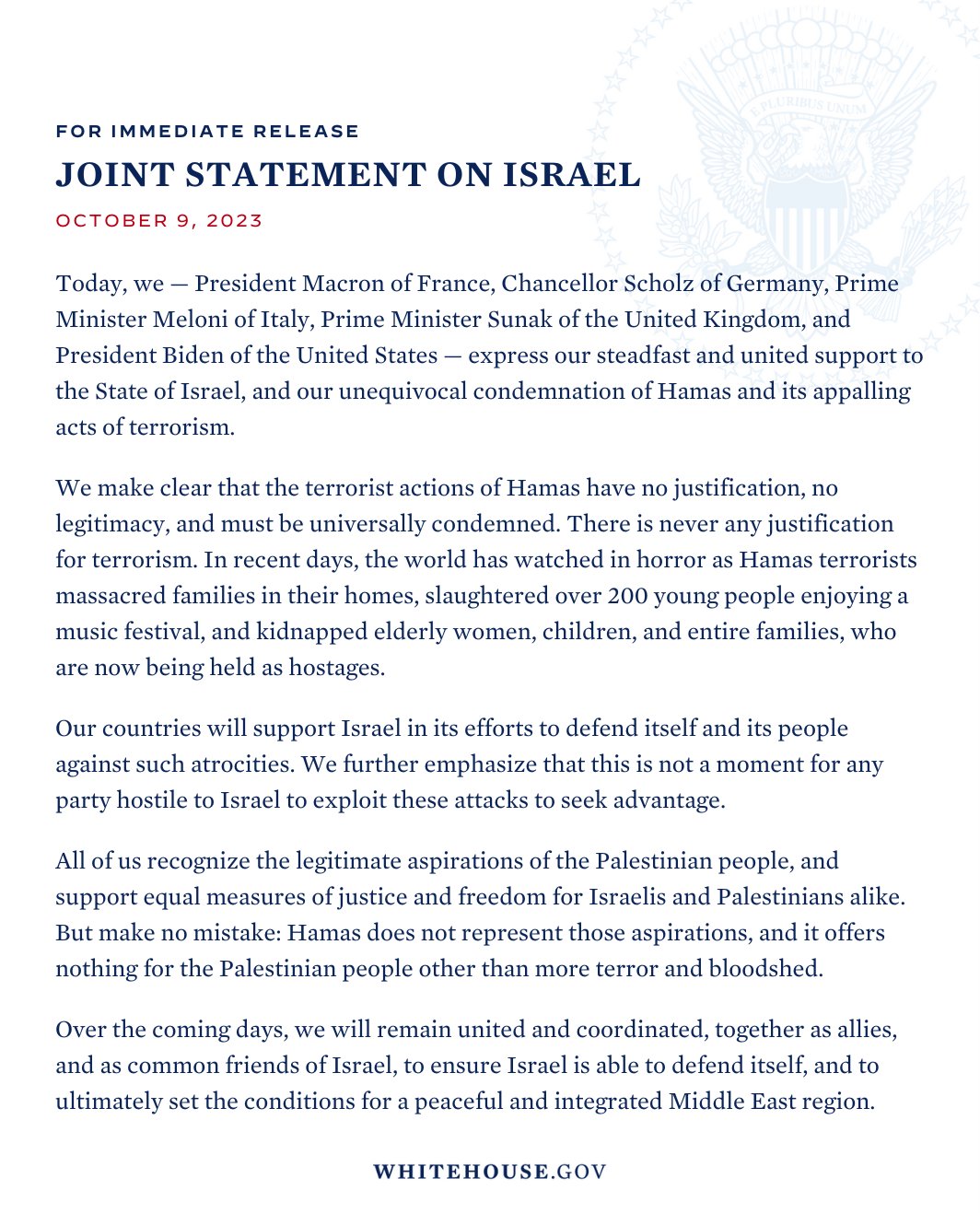 DECLARACIÓN CONJUNTA SOBRE ISRAEL 9 DE OCTUBRE DE 2023 Hoy, nosotros, el presidente Macron de Francia, el Canciller Scholz de Alemania, el primer ministro Melon de Italia, el Primer Ministro Sunak del Reino Unido y el Presidente Biden de los Estados Unidos, expresamos nuestro apoyo firme y unido al Estado de Israel y nuestra condena inequívoca de Hamás y sus atroces actos de terrorismo.