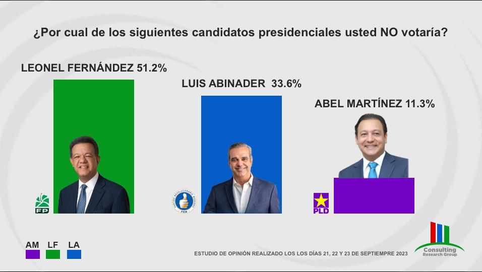 Sobre el candidato por el que no votarían, 51.2% dijo que por Leonel Fernández (FP), 33.6% por Luis Abinader (PRM) y 11.3% por Abel Martínez (PLD).