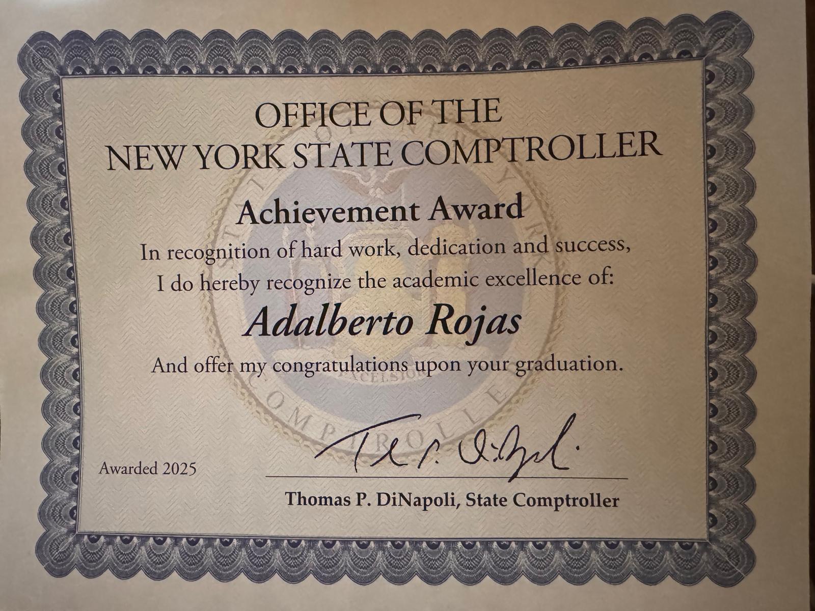 En el marco de la ceremonia de graduación de la clase 2025, Adalberto recibió el prestigioso “Student Achievement Award” otorgado por el Contralor del Estado de Nueva York, Thomas P. DiNapoli, en reconocimiento a su esfuerzo, dedicación, liderazgo y desempeño académico excepcional. El premio, que se otorga anualmente a estudiantes sobresalientes del sistema escolar neoyorquino, honra a jóvenes que no solo logran altos estándares académicos, sino que también se distinguen por su servicio voluntario a la escuela o a la comunidad.