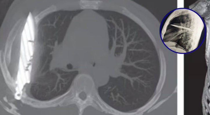 Una radiografía de tórax reveló la impactante verdad: un objeto metálico retenido que resultó ser un cuchillo completo en el interior de su pecho. El arma había penetrado a través de su escápula y se encontraba rodeada de pus y tejido necrótico, creando la infección que finalmente lo llevó a buscar ayuda médica.