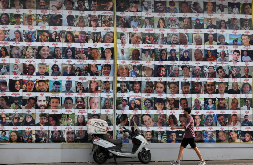 - La gente pasa junto a una pared que muestra carteles de rehenes, en Tel Aviv, Israel, el 18 de agosto de 2024 (crédito: REUTERS/FLORION GOGA)