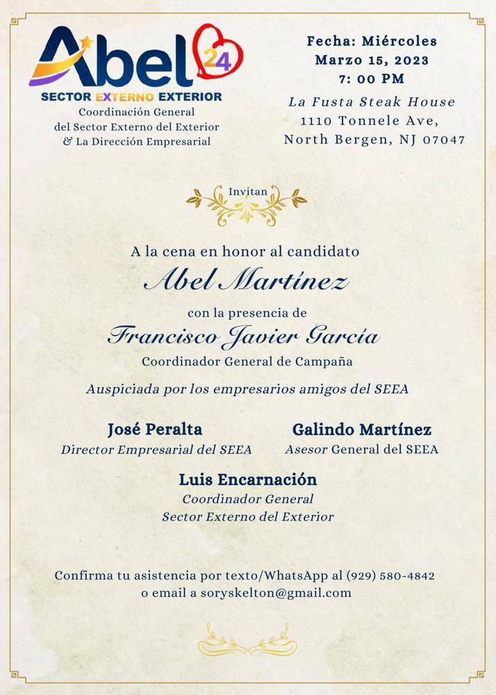 La actividad se trata de una cena en honor al candidato presidencial del PLD, Abel Martínez, con la presencia del Coordinador General de Campaña, Francisco Javier García, auspiciada por los empresarios amigos (SEEA), José Peralta, director empresarial; Galindo Martínez, Asesor General del (SEEA) y Luis Encarnación, Coordinador General Sector Externo del Exterior.