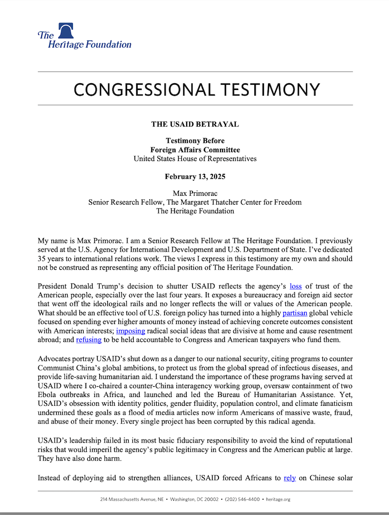 El Congreso norteamericano publicó en su página oficial un borrador de tres páginas que resume el testimonio de Max Primorac. En él se revela que la USAID es solo la punta del iceberg, y que los tentáculos de la corrupción administrativa en los gobiernos demócratas de Barack Hussein Obama II y Joseph Robinette Biden Jr. (Joe) llevaron a un uso abusivo de esa agencia a nivel global.