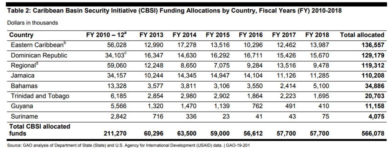 En años anteriores, la financiación de la CBSI se destinó a la República Dominicana para operaciones antidrogas, mejorando la contratación, capacitación y preparación de la policía dominicana, así como esfuerzos para que RD segure su frontera con Haití.