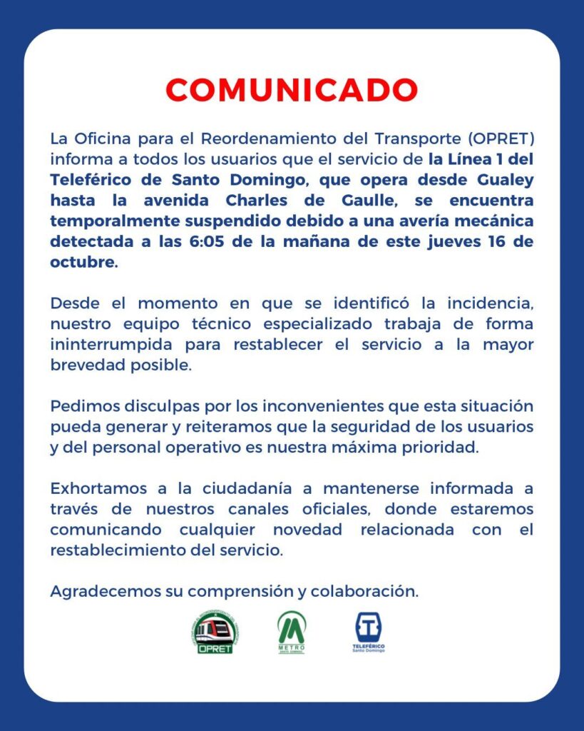 Santo Domingo, R.D. – La Oficina para el Reordenamiento del Transporte (OPRET) informó que el servicio de la Línea 1 del Teleférico de Santo Domingo, que opera desde Gualey hasta la avenida Charles de Gaulle, se encuentra temporalmente suspendido debido a una avería mecánica detectada a las 6:05 de la mañana de este jueves 16 de octubre.