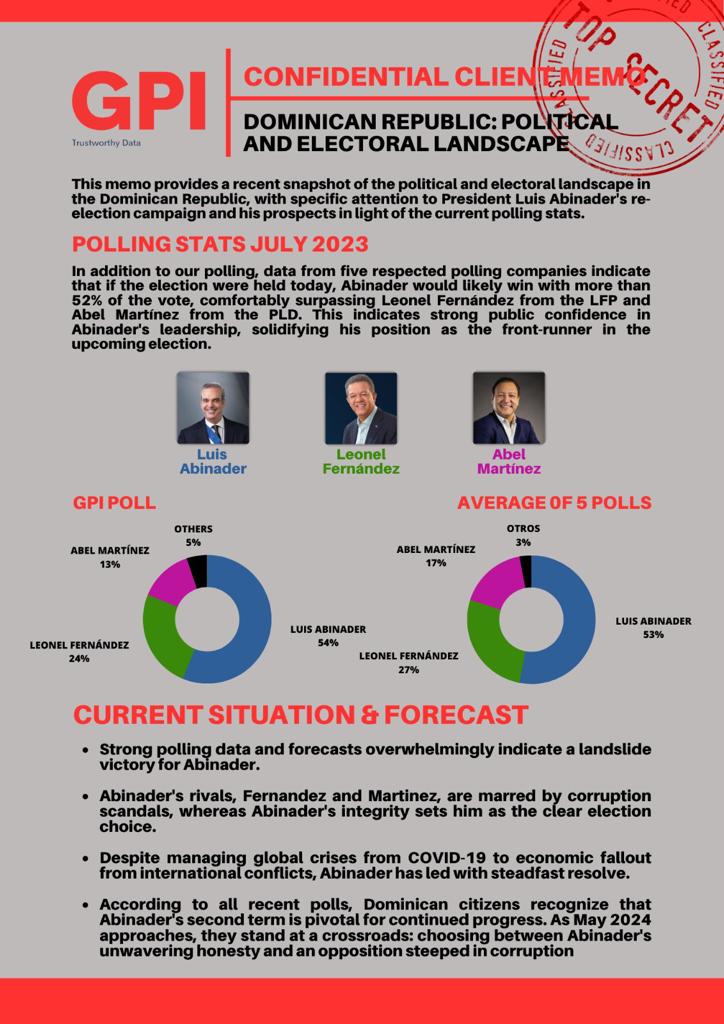 En adición con la data estadística o muestreo de cinco empresas, indican que si las elecciones se efectuarán hoy Abinader probablemente ganaría con más del 52% de los votos, superando cómodamente a Leonel Fernández de la Fuerza del Pueblo y Abel Martínez del Partido de la Liberación Dominicana.