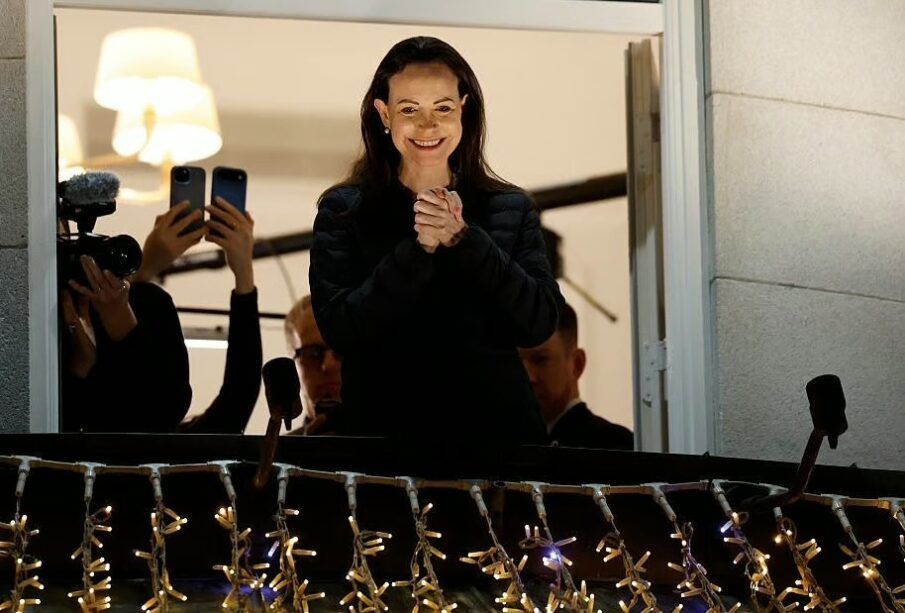 La líder opositora venezolanaMaría Corina Machado salió este viernes al balcón del Grand Hotel de Oslo tras llegar a la capital noruega, desde donde saludó ya de madrugada, visiblemente cansada pero sonriente, a sus seguidores y cantó el himno de su país con la mano en el pecho.