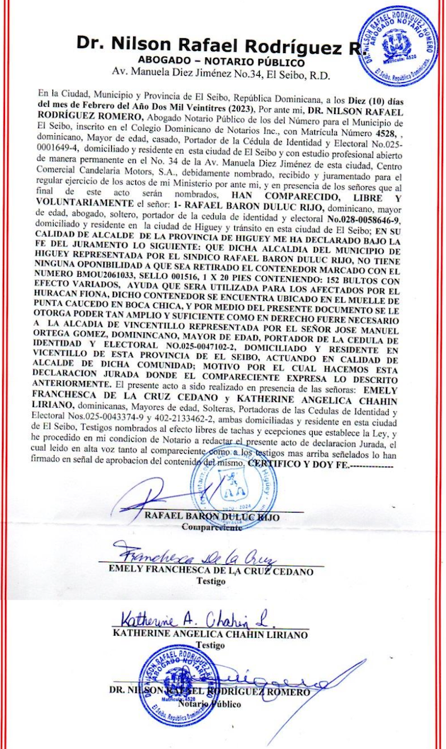 Por lo general, va a pública subasta para resarcir los costos y deudas que ha generado. Sin embargo, esta acción ha sido detenida por un requerimiento hecho por José Manuel Ortega Gómez, alcalde de San Francisco de Vicentillo, una apartada y empobrecida comunidad de la provincia de El Seibo, quien diligencia a través del Ministerio de Hacienda para ver cómo pueden adjudicarle el contenedor, ya que el alcalde de Higüey, Rafael Barón Duluc Rijo, firmó un acto notarizado pasándole el derecho para que reclame el contenedor en beneficio de los moradores de San Francisco-Vicentillo. Ver copia fiel del acto notarizado firmado por ambos alcaldes: