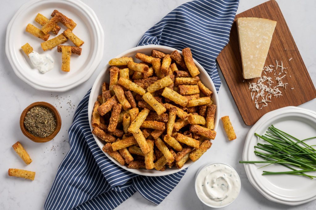 Chips de Pasta en Freidora de Aire: Este aperitivo divertido y diferente se puede disfrutar con un delicioso dip de crema agria y cebolla que también incluye esta receta. La clave está en que los rigatoni queden dorados y crujientes.