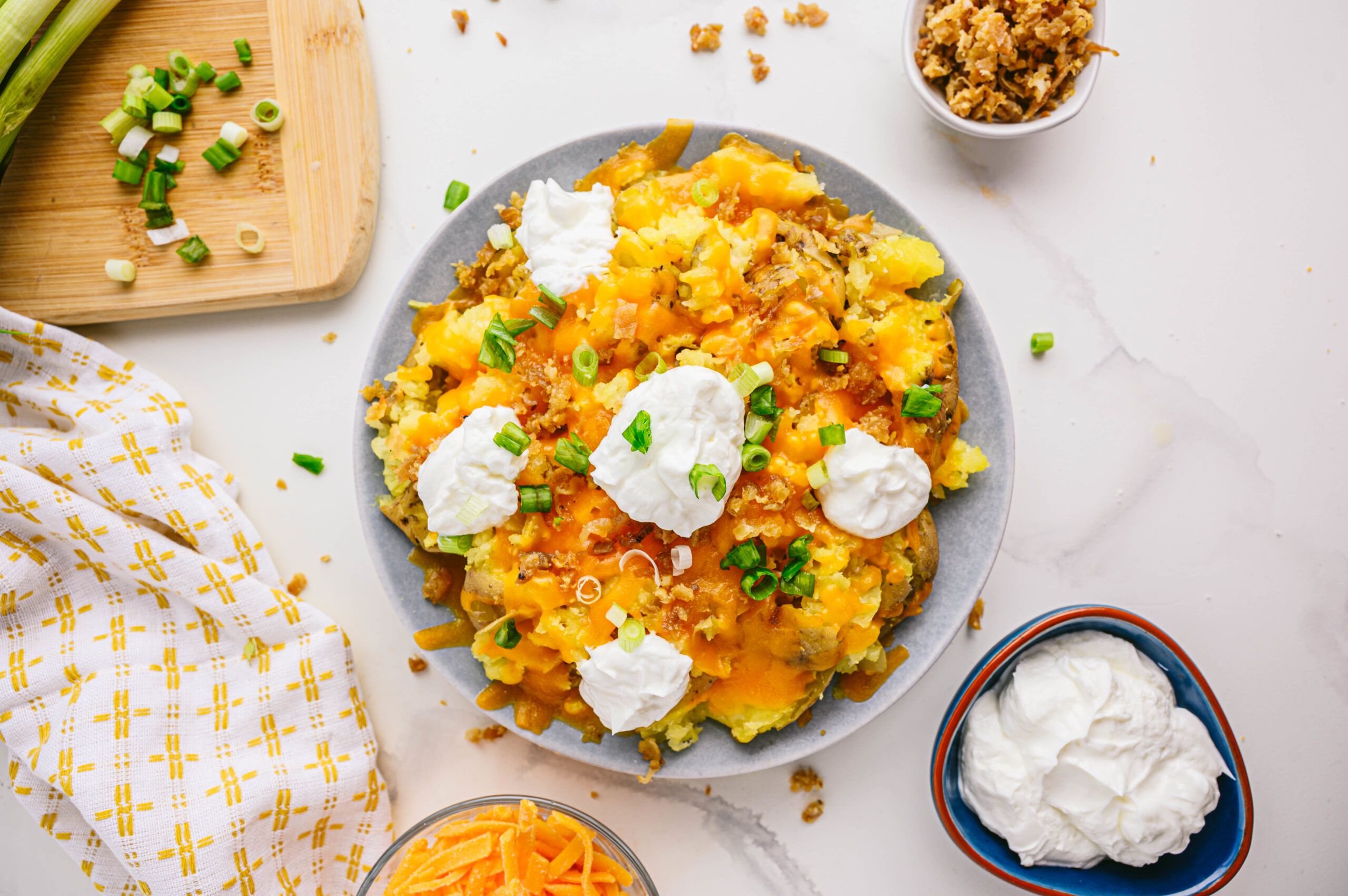 Cubre las papas con crema agria y cebollas verdes si lo deseas.
