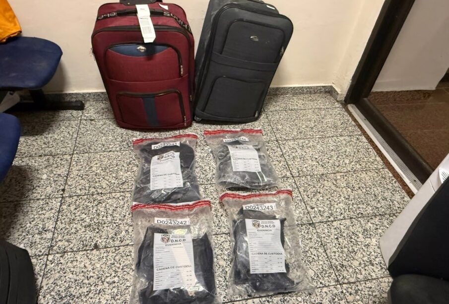 Posteriormente se inició una inspección, descubriendo en ambos equipajes un doble fondo, donde se confiscaron los cuatro paquetes de la presunta droga, envueltos en fundas de color negro con un material engomado.